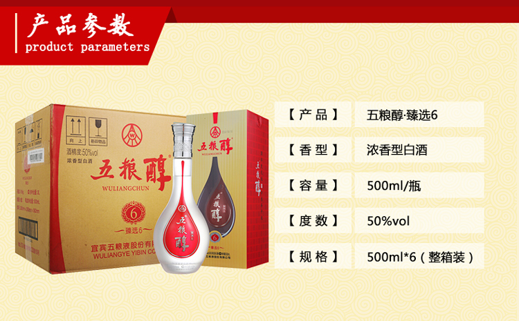 包装:整箱装;容量:500-749mL;香型:浓香型;产地:四川;度数:50度及以上;酒精度:50%vol;容量:500;产品重量:9920g;包装清单:五粮液股份有限公司 五粮醇 臻选6 50度浓香型白酒500ml*6 整箱装;