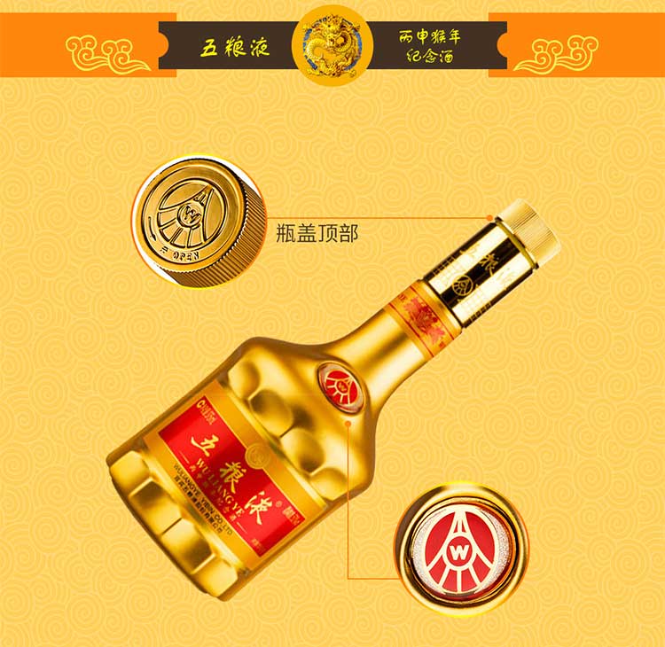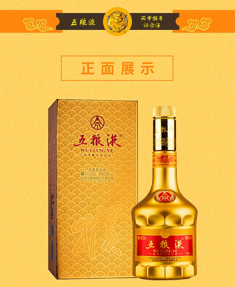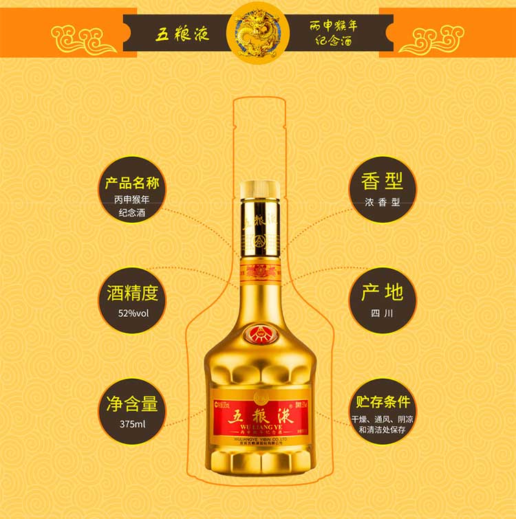 包装:瓶装;容量:375mL及以下;香型:浓香型;度数:50度以上;容量:375ML;产品重量(kg):1.455;包装:单瓶;存储方法:常温;酒精度:52;香型:浓香型;等级:优级;省份:四川;包装清单:五粮液 丙申猴年纪念酒 浓香型白酒 52度 375ml 单瓶装;