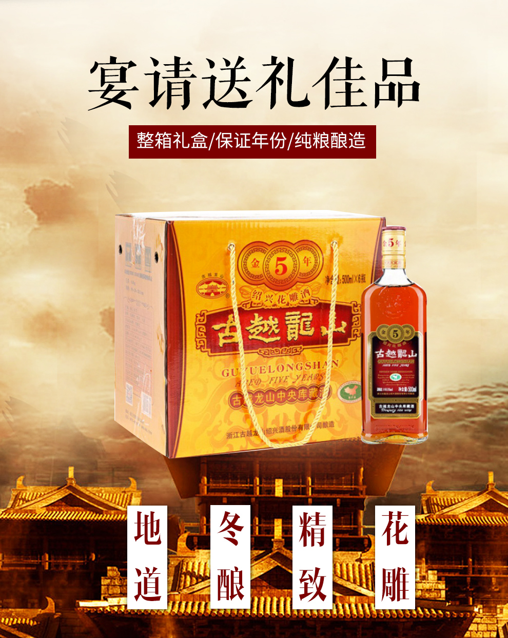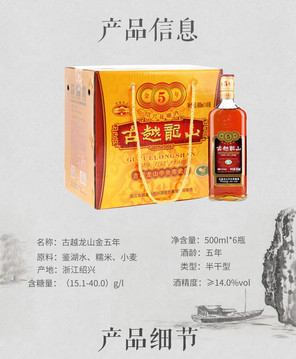 口味:半干型黄酒(总糖:15.0-40.0g/L);度数:10-19度;产地:浙江;适用场景:商务宴请,礼节拜访,家庭聚会,朋友小聚,自斟自饮;包装:整箱装;容量:500mL以下;保质期:无;酒精度:14;存储方法:阴凉避光处保存;容量:3000mL;产品重量:3kg;包装清单:古越龙山 绍兴黄酒 中央库藏金五年 半干型 500ml*6;