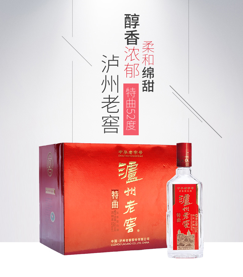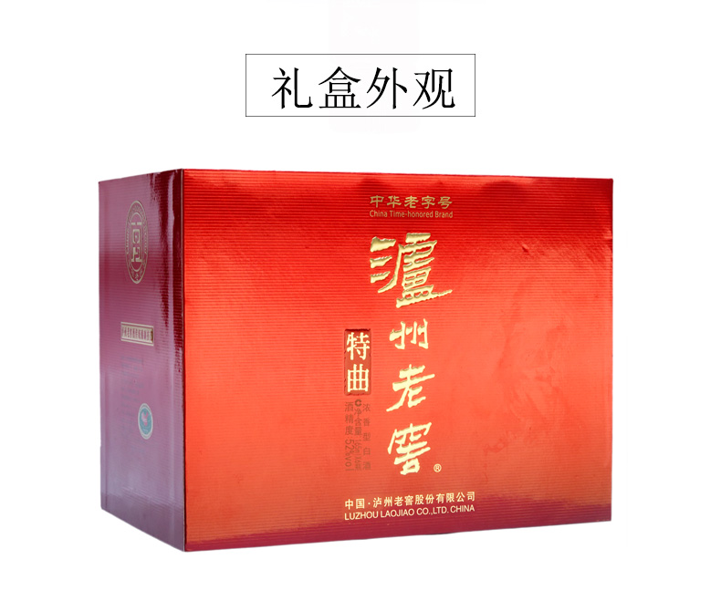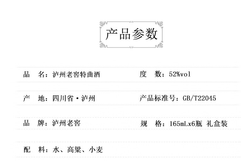 包装:瓶装;容量:375mL及以下;香型:浓香型;产地:四川;度数:50度及以上;酒精度:52%vol;容量:165ml*6;产品重量:200g;包装清单:泸州老窖 特曲 165ml*6瓶(2018版) 礼盒装× 1;