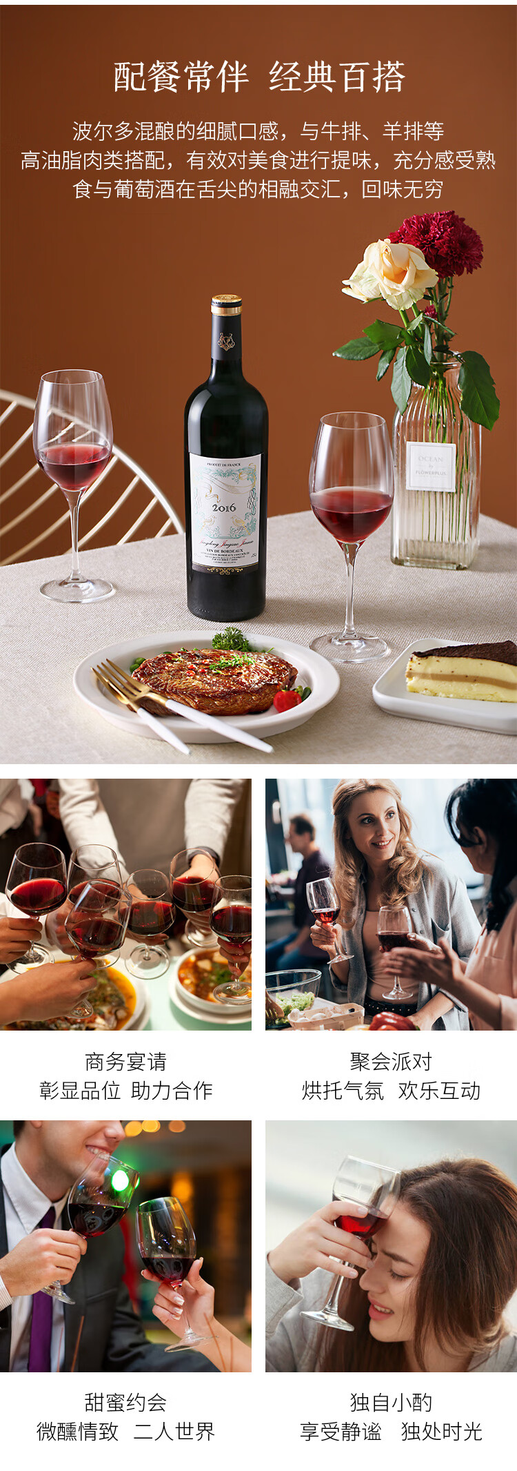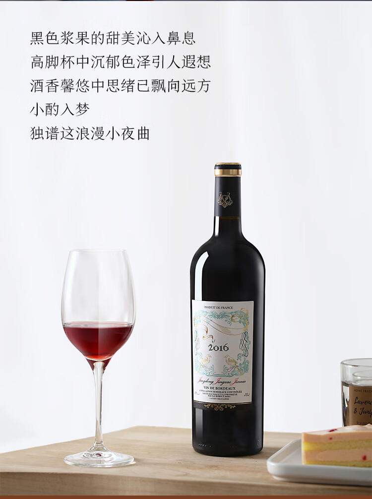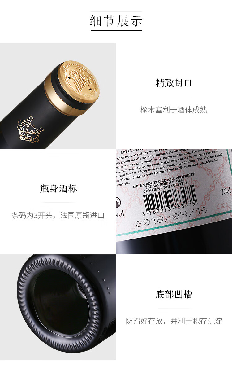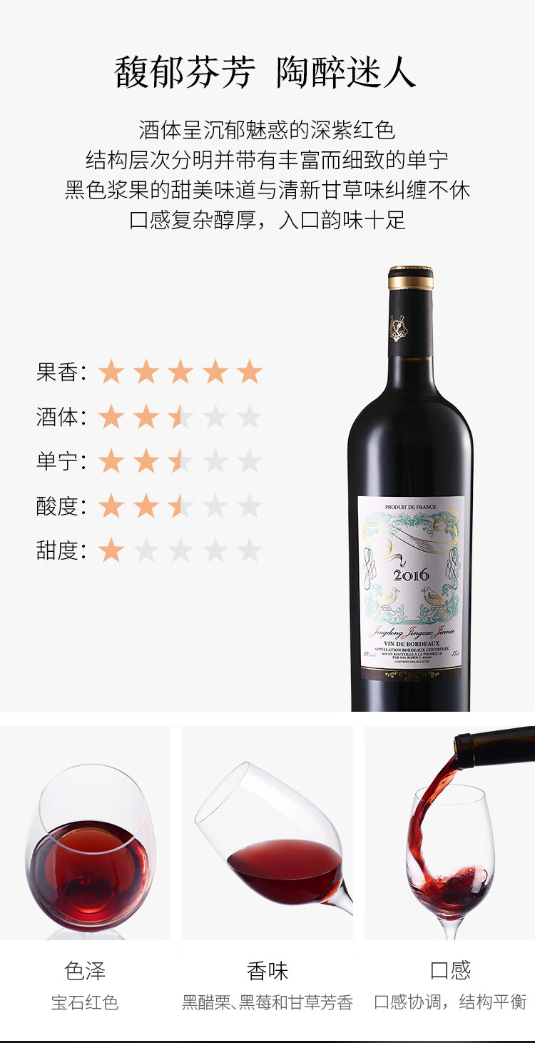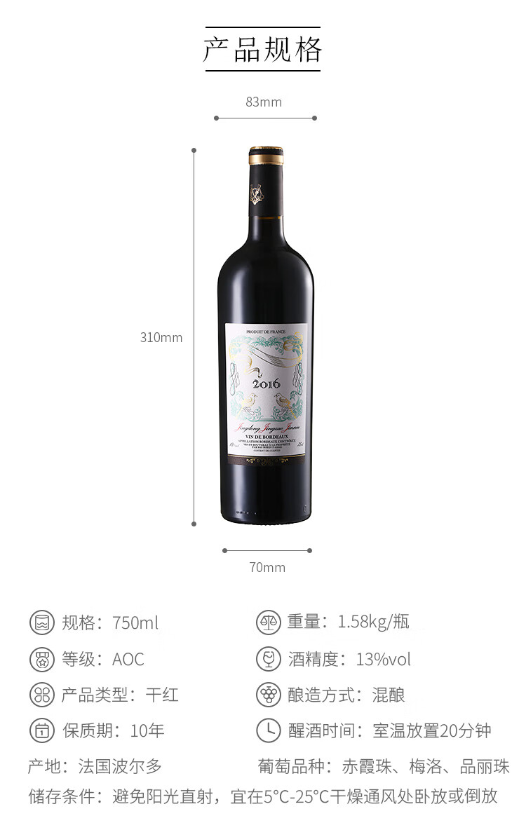 颜色:宝石红;口感:饱满;特性:法定产区酒(AOC/AOP等);国产/进口:进口;适用场景:礼节拜访,商务宴请,婚礼婚宴,情侣约会,家庭聚会,自斟自饮,闺蜜私语,派对活动;包装:瓶装;酸度:中酸;类别:红葡萄酒;葡萄品种:混合(Blending),品丽珠(Cabernet Franc),赤霞珠(Cabernet Sauvignon),梅洛(Merlot);类型:静止酒;产地:法国;容量:750mL;甜度:干型;保质期:10年;酒精度:13%vol;原产地:法国;存储方法:恒温恒湿,避光避震;容量:750ml;产品重量:1.58kg;包装清单:750ml*1瓶;
