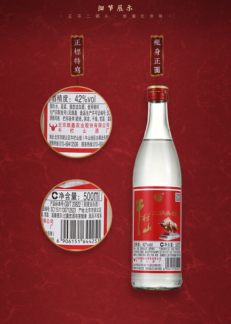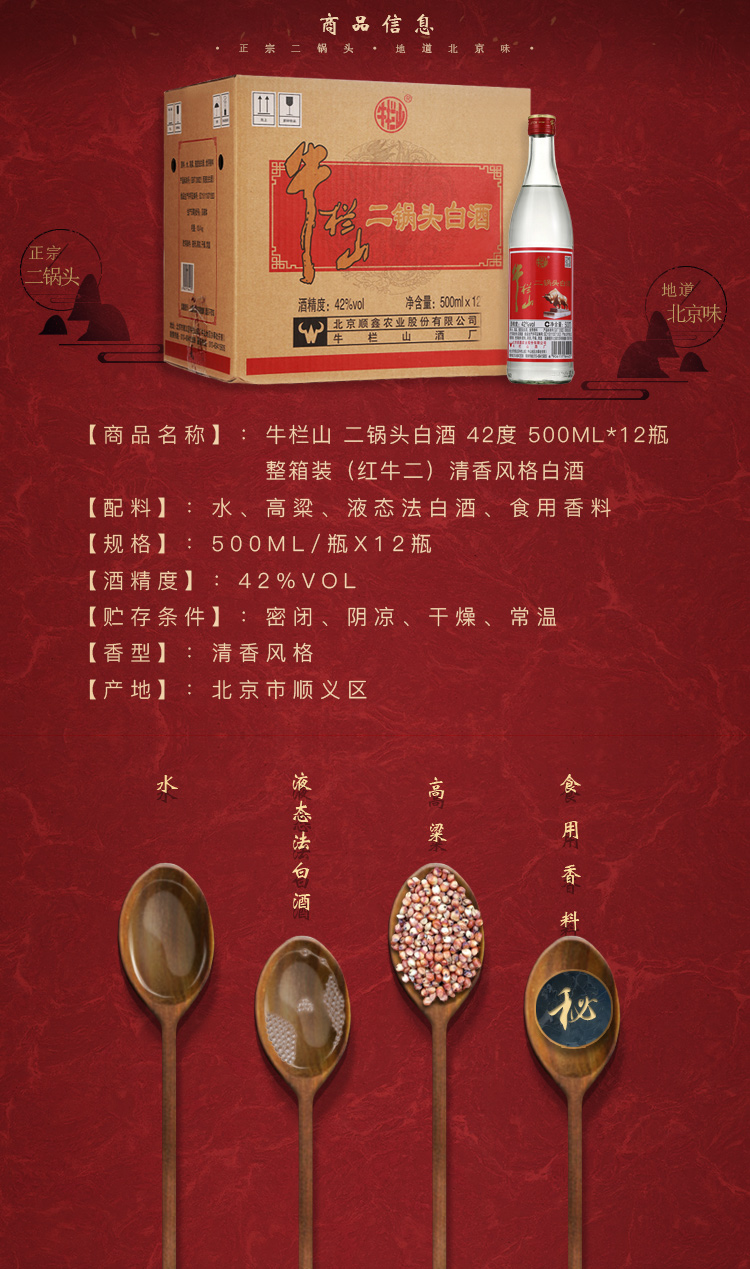 包装:整箱装;容量:376-499mL;香型:清香型;度数:40-49度;香型:清香型;产地:北京或河北;酒精度:42%vol;包装:整箱装;产品重量:10.28g;容量:500ml*12;包装清单:牛栏山 二锅头白酒 42度 500ml*12瓶 整箱装(红牛二)清香风格白酒*1;