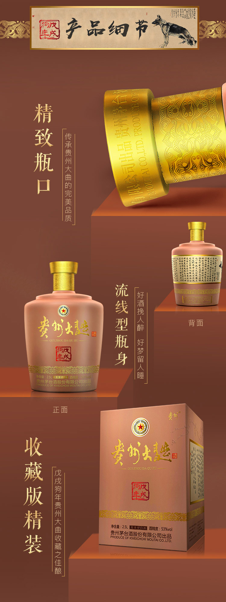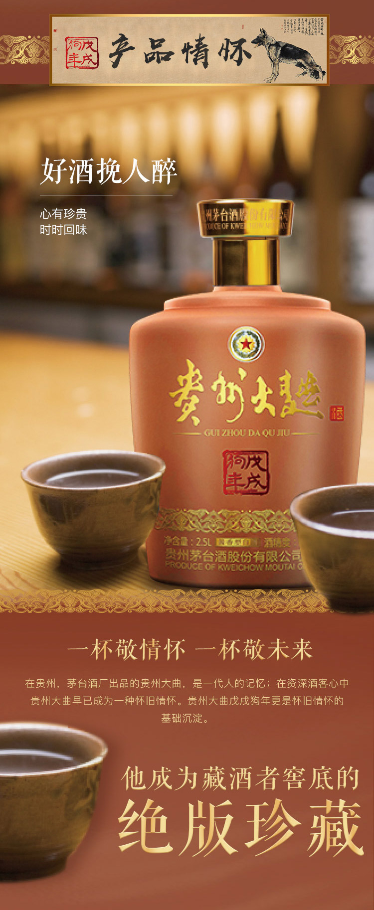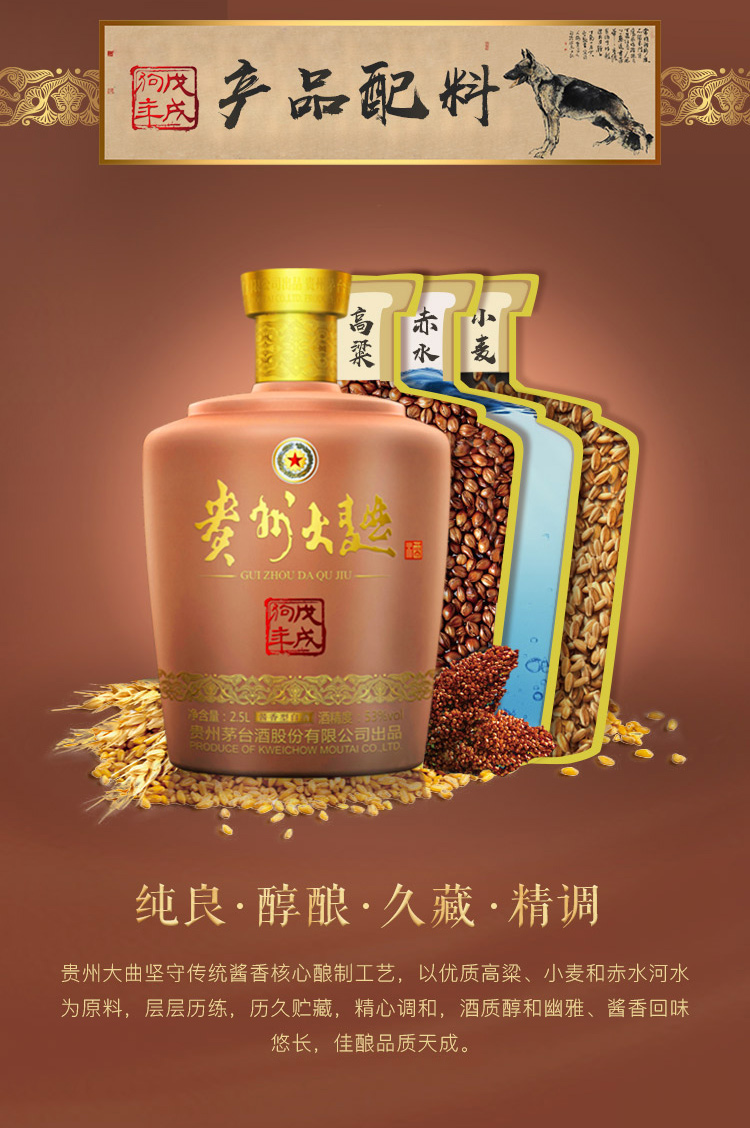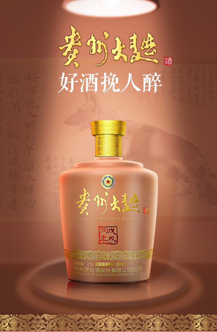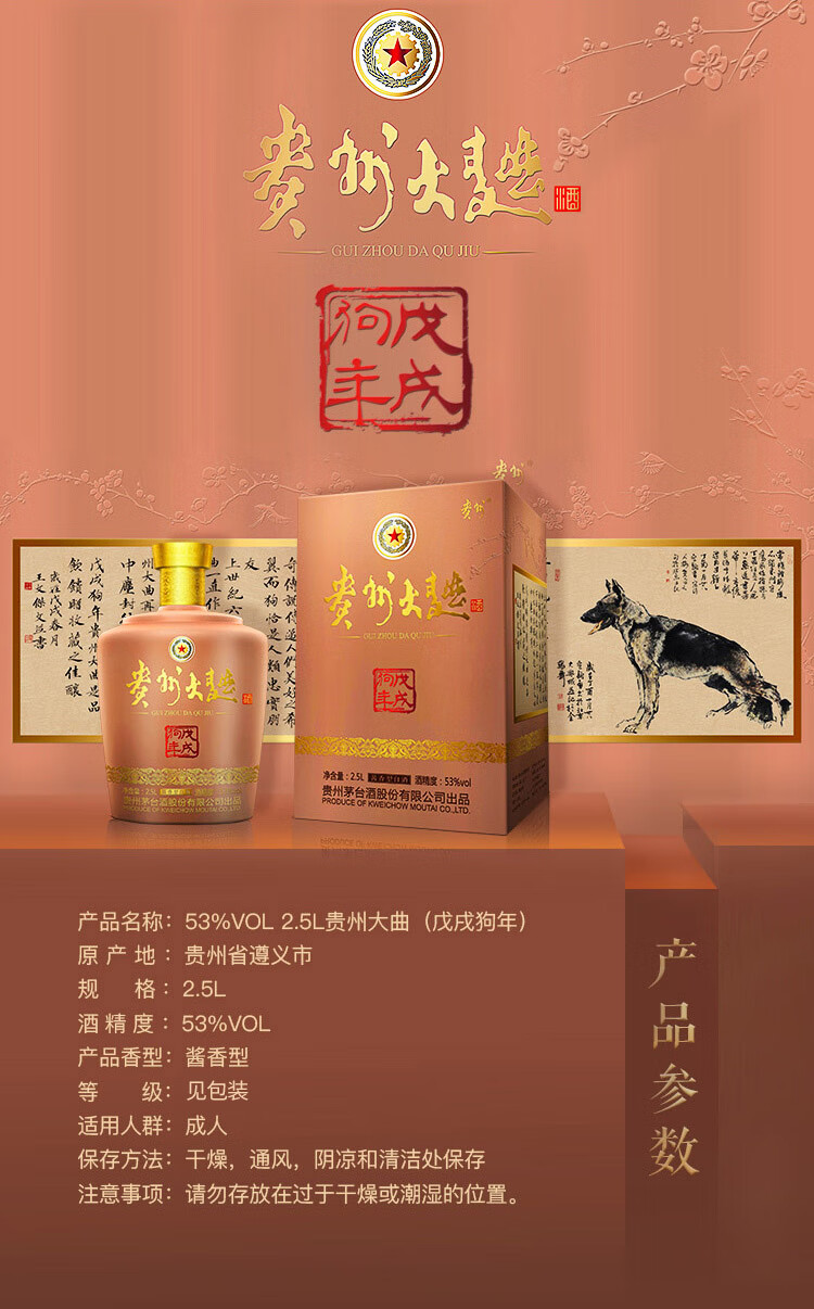 包装:整箱装;容量:750mL及以上;香型:酱香型;度数:50度以上;容量:2.5L;产品重量(kg):7;包装:整箱;存储方法:阴凉、干燥、密封保存;酒精度:53;香型:酱香型;等级:见包装;省份:贵州;包装清单:贵州大曲酒戊戌狗年生肖酒53度2.5L*1;
