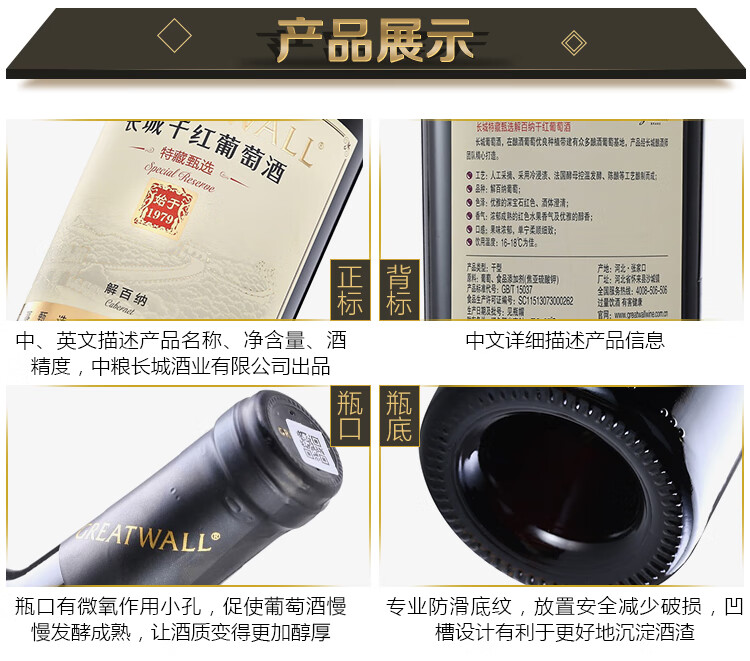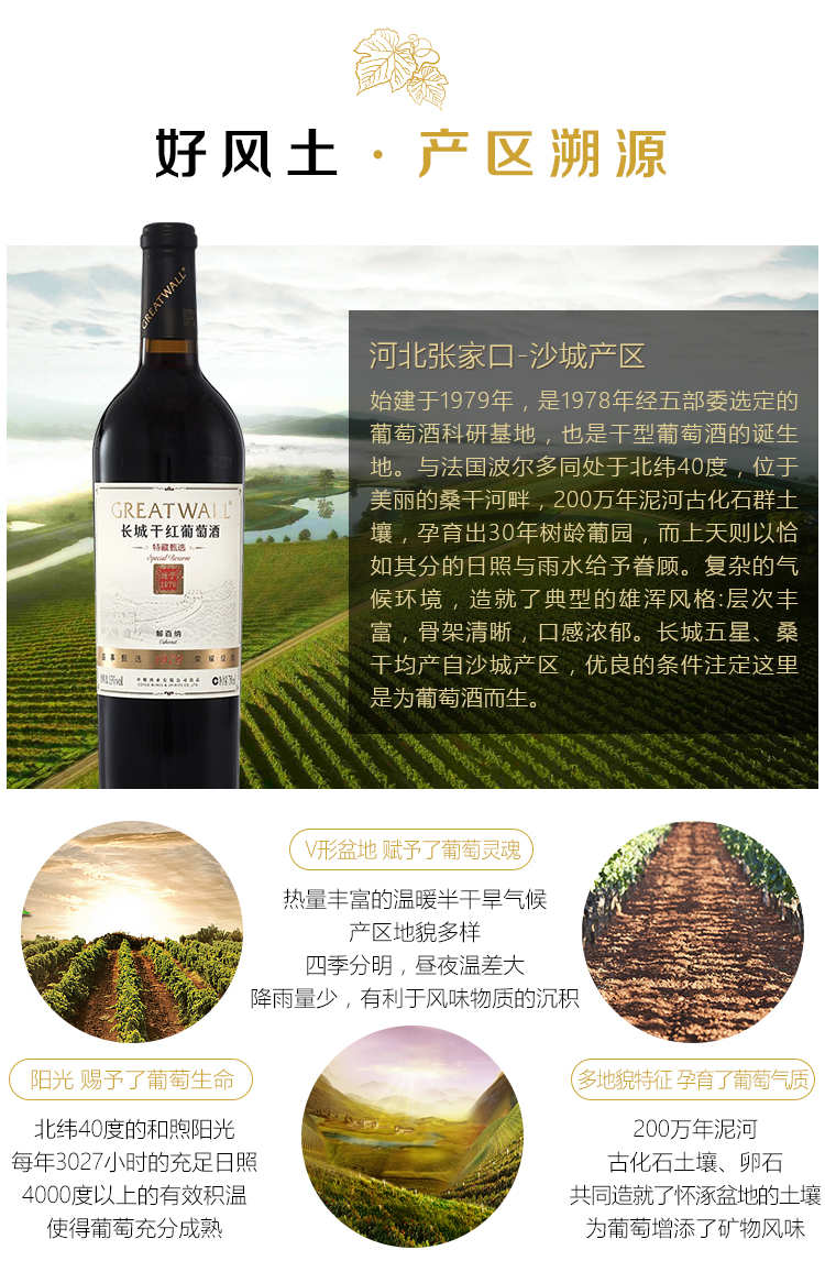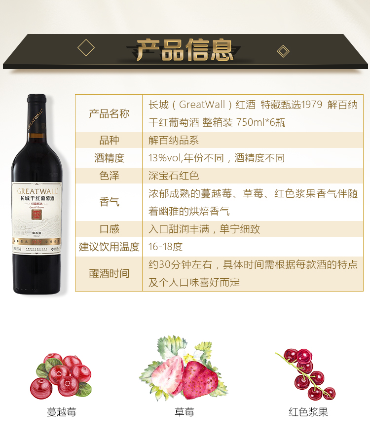 颜色:宝石红;口感:饱满;特性:精品葡萄酒;国产/进口:国产;适用场景:家庭聚会,礼节拜访,商务宴请,婚礼婚宴,情侣约会,自斟自饮,闺蜜私语,派对活动;包装:整箱装;酸度:中酸;类别:红葡萄酒;葡萄品种:赤霞珠(Cabernet Sauvignon),蛇龙珠(Cabernet Gernischt),品丽珠(Cabernet Franc);类型:静止酒;香型:果香,烘烤;产地:中国大陆;容量:750mL;甜度:干型;保质期:3650天;酒精度:13vol;原产地:中国大陆;存储方法:避免阳光直射,于5℃~25℃干燥通风处卧放或倒放为宜。;容量:750ml;产品重量:0kg;包装清单:长城(GreatWall)红酒 特藏甄选1979 解百纳干红葡萄酒 整箱装 750ml*6瓶*1箱;