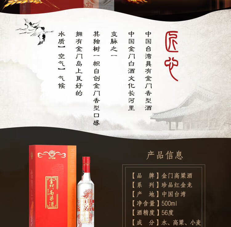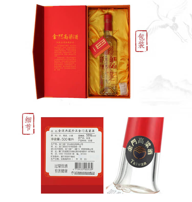 包装:瓶装;容量:500-749mL;香型:其它;产地:中国台湾;度数:50度及以上;酒精度:56%vol;容量:500ml;产品重量:1650g;包装清单:金门高粱酒 典藏珍品红龙500ml*1盒;