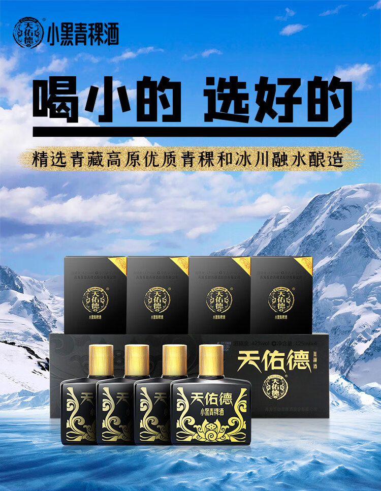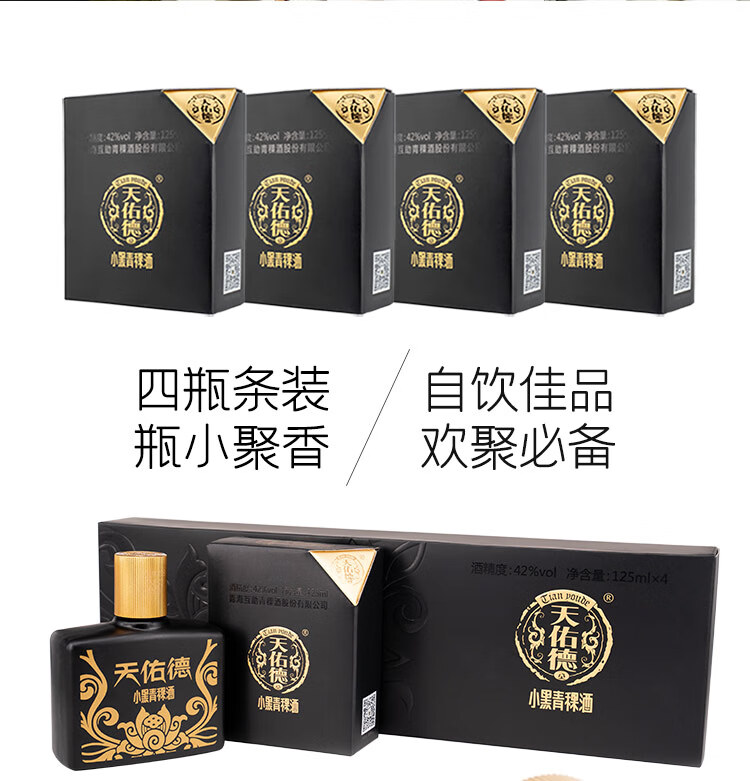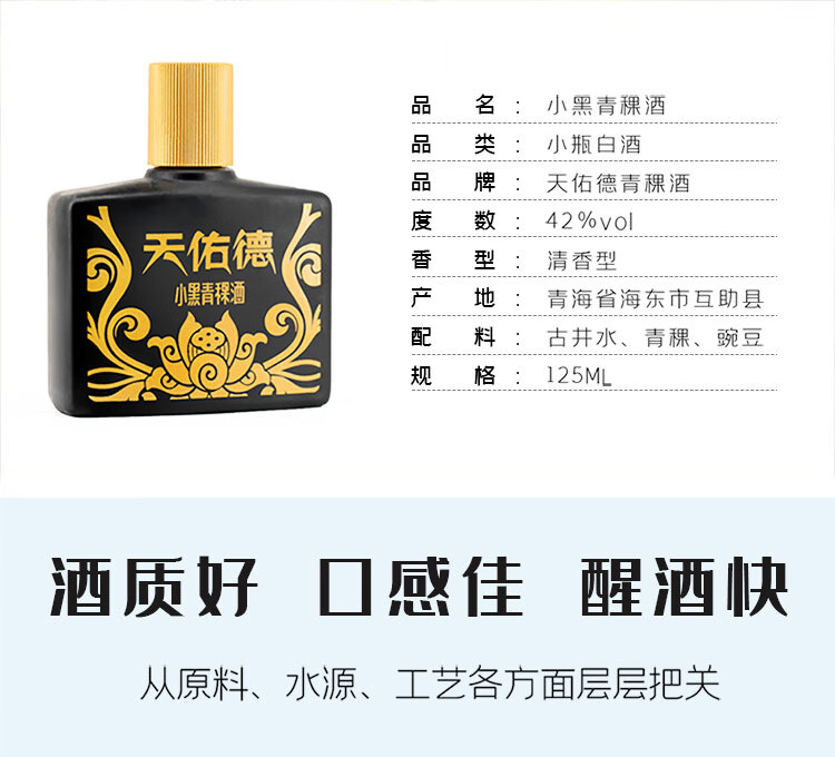 包装:瓶装;容量:375mL及以下;香型:清香型;产地:青海;度数:40-49度;酒精度:42%vol;容量:125;产品重量:1.54g;包装清单:青海天佑德 青稞酒(小黑) 42度 清香型白酒 单盒装 125ml*4瓶;