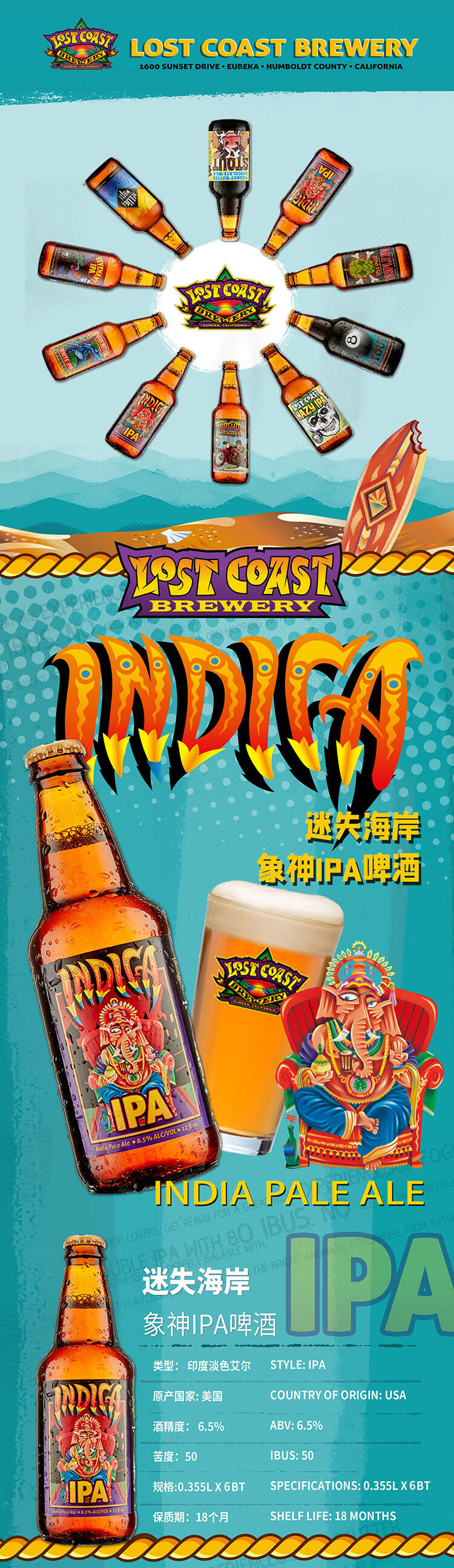 国产/进口:进口;产地:美国;适用场景:家庭聚会,自斟自饮,派对必备,烧烤撸串,酒吧夜店;包装:组合装;容量:331-499mL;类别:精酿;原料:水、麦芽、啤酒花、酵母;保质期:18个月;酒精度:6.5% vol;原产地:美国;原麦汁浓度:14.5°P;存储方法:存放于阴凉干燥处,请勿倒置,冰镇后饮用更佳;容量:355ml;产品重量:3.56kg;包装清单:迷失海岸 (LOST COAST) 象神IPA啤酒 355ml*6瓶;