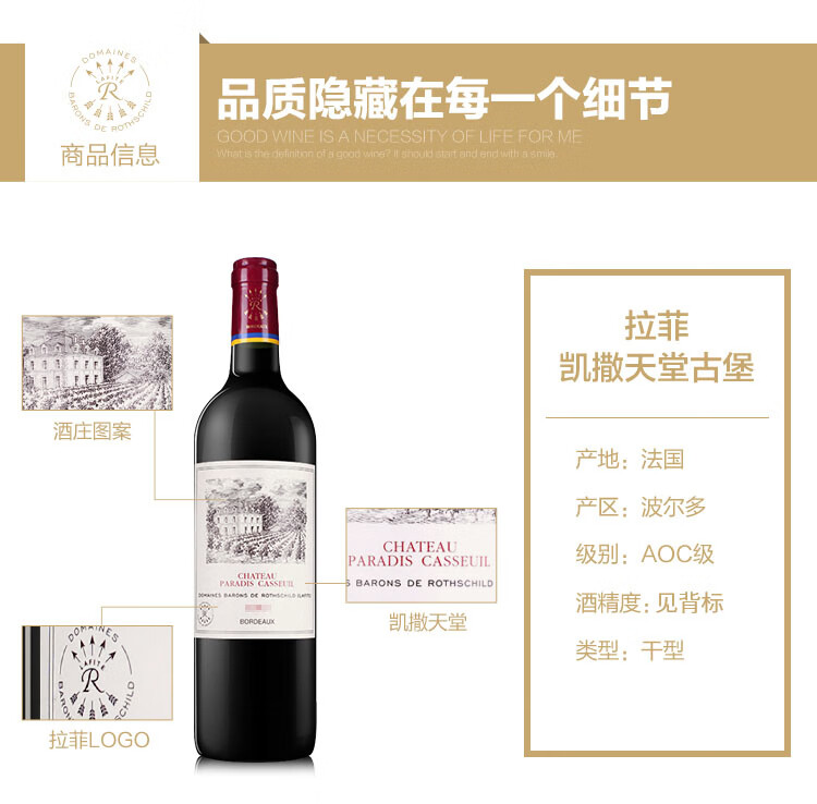 颜色:宝石红;口感:饱满;特性:法定产区酒(AOC/AOP等);国产/进口:进口;适用场景:礼节拜访;包装:礼盒装;酸度:中酸;类别:红葡萄酒;葡萄品种:混合(Blending);类型:静止酒;香型:果香;产地:法国;容量:750mL;甜度:干型;保质期:3650天;酒精度:详见实物背标;原产地:法国;存储方法:避光、卧放;容量:750ml;产品重量:3.5kg;包装清单:拉菲凯萨天堂古堡AOC干红葡萄750ml*2、精美礼盒*1、海马刀*1、止滴环*1、酒塞*1、倒酒器*1;