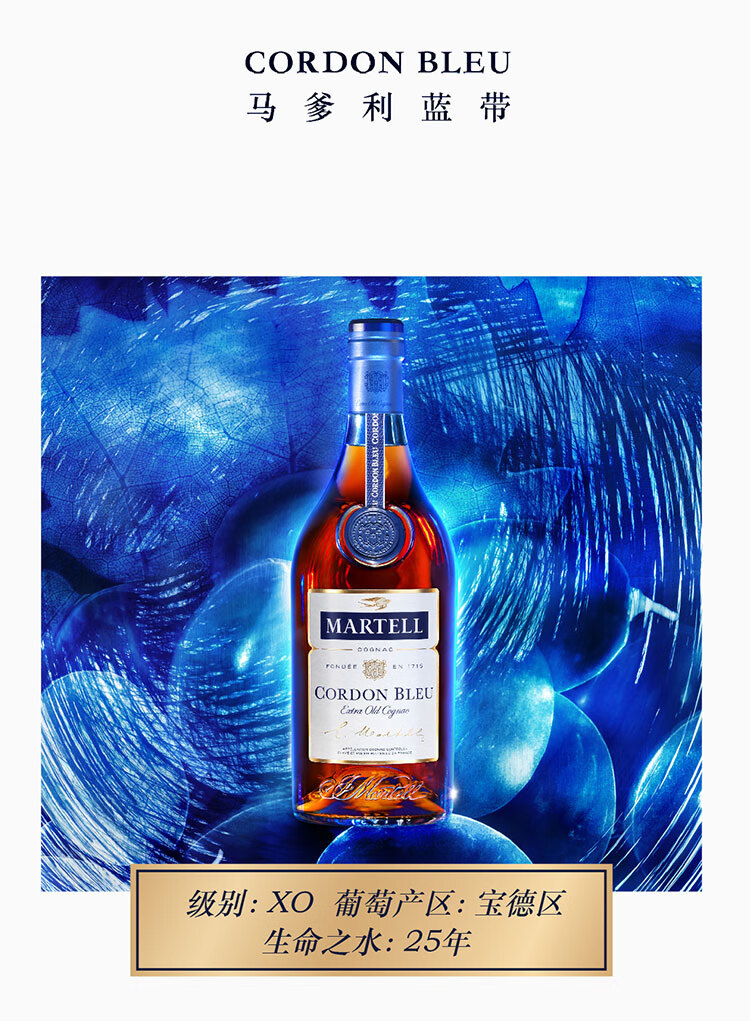 特性:XO;国产/进口:进口;产地:法国;适用场景:闺蜜私语,亲友馈赠,自斟自饮,商务宴请,家庭聚会;包装:瓶装;容量:500-699mL;原料:葡萄、水、焦糖色;保质期:无;酒精度:40%vol;存储方法:常温避光;产品重量:1.07kg;容量:500mL;包装清单:马爹利(Martell)洋酒 蓝带 干邑 白兰地 500ml*1;