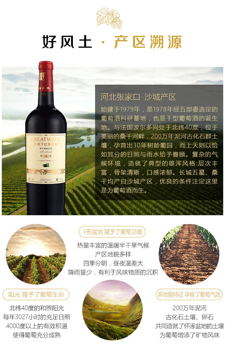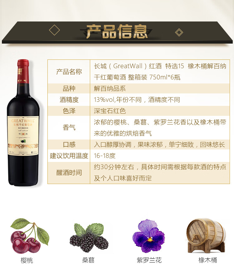 颜色:宝石红;采摘年份:2018年;口感:饱满;特性:精品葡萄酒;国产/进口:国产;适用场景:家庭聚会,礼节拜访,商务宴请,婚礼婚宴,情侣约会,自斟自饮,派对活动;包装:整箱装;酸度:中酸;类别:红葡萄酒;葡萄品种:赤霞珠(Cabernet Sauvignon),蛇龙珠(Cabernet Gernischt),品丽珠(Cabernet Franc);类型:静止酒;香型:果香,植物,烘烤,巧克力;产地:中国大陆;容量:750mL;甜度:干型;系列:特选;保质期:3650天;酒精度:13%vol;原产地:中国大陆;存储方法:避免阳光直射,于5℃~25℃干燥通风处卧放或倒放为宜;容量:750ml;产品重量:10kg;包装清单:长城(GreatWall)红酒 特选15 橡木桶解百纳干红葡萄酒 整箱装 750ml*6瓶 *1箱;