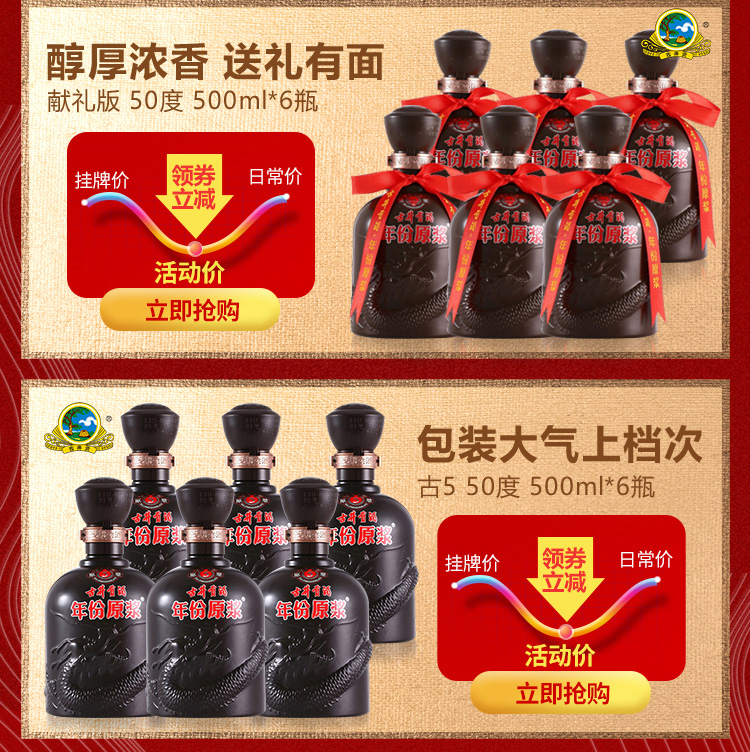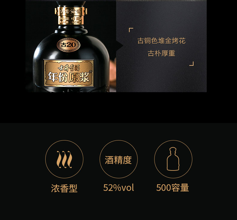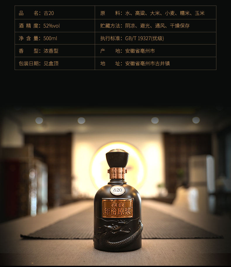 包装:瓶装;容量:376-499mL;香型:浓香型;度数:50度以上;容量:500ml;产品重量(kg):1.8 kg;包装:单瓶;存储方法:避光处,阴凉处;酒精度:52;香型:浓香型;等级:优;省份:安徽;包装清单:古井贡酒 中国香古20 52度 单瓶装白酒500ml*1;