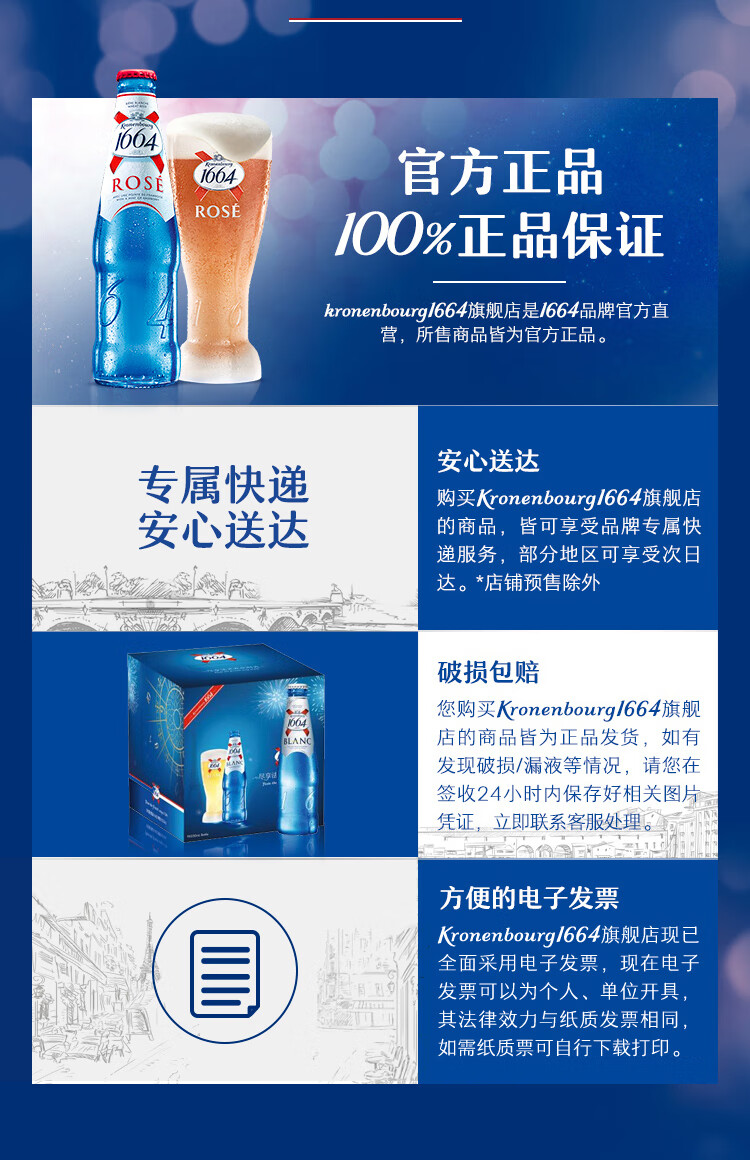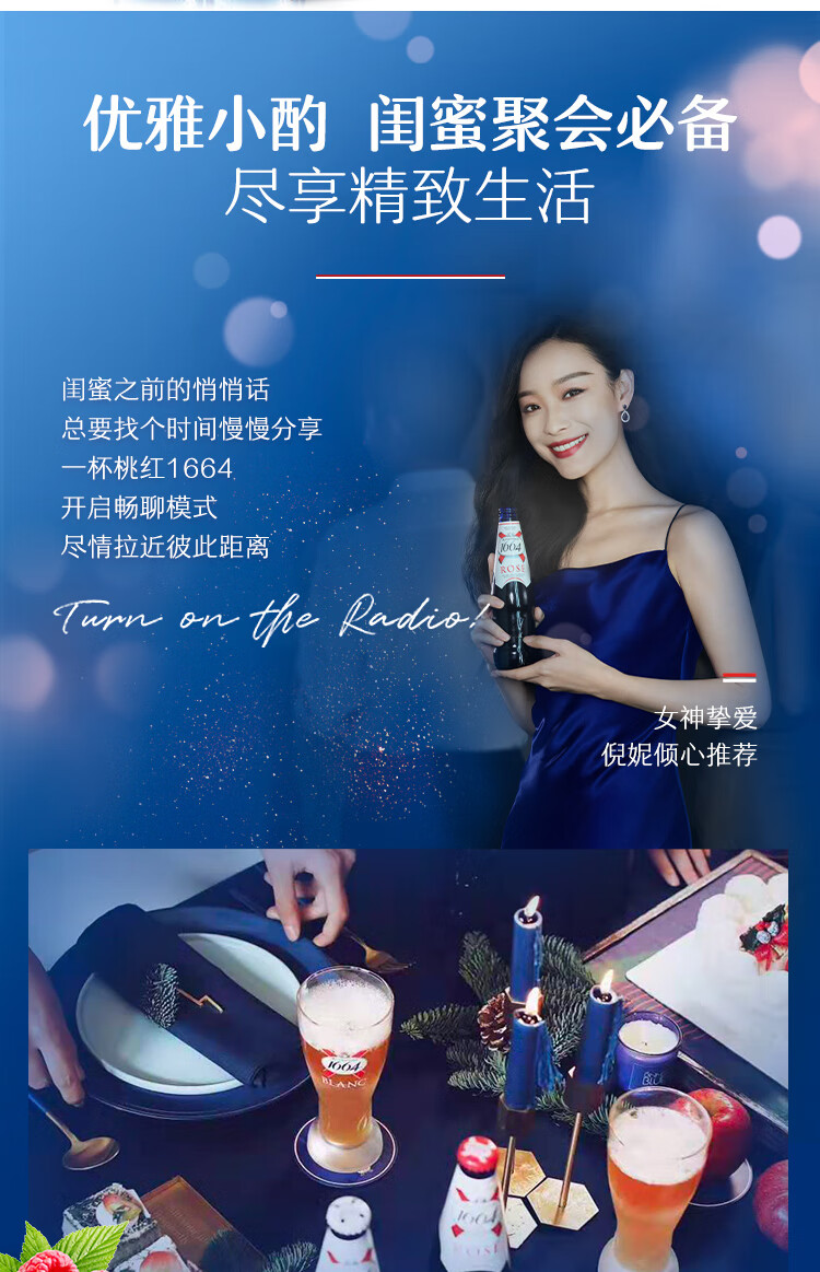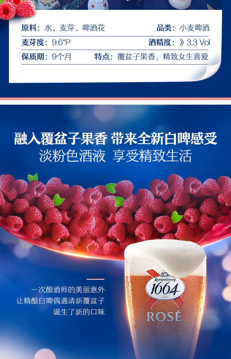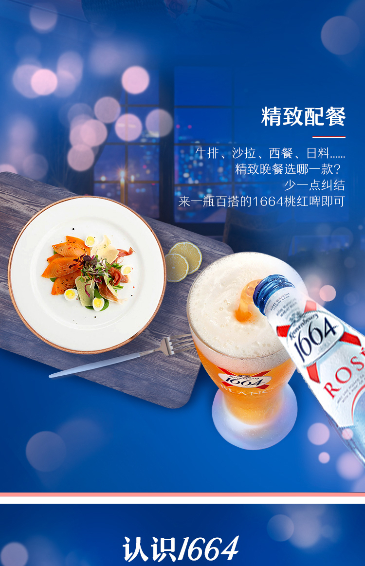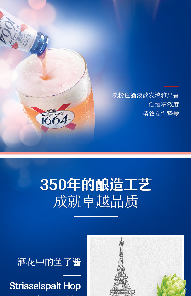 国产/进口:国产;产地:中国大陆;适用场景:礼节拜访,家庭聚会,自斟自饮,情侣约会,烧烤撸串,派对必备,酒吧夜店;包装:瓶装;容量:330mL;类别:白啤酒;原料:水、麦芽、小麦、果葡糖浆、白砂糖、食用香精、柠檬酸、复合浓缩汁(胡萝卜、黑加仑)、酒花;保质期:9个月;酒精度:3.3vol;原产地:中国大陆;原麦汁浓度:11.8;存储方法:阴凉避光储存;产品重量:5.72kg;容量:330;包装清单:1664啤酒 桃红啤酒 330ml*9瓶;