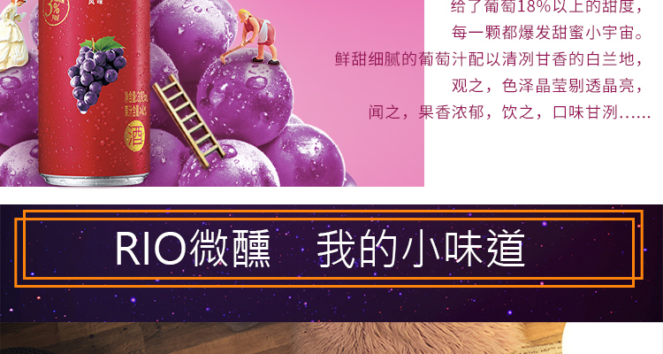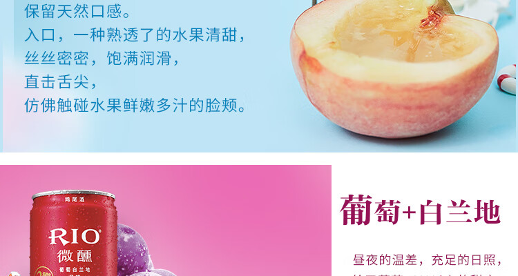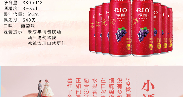 国产/进口:国产;产地:中国大陆;适用场景:家庭聚会,商务宴请,情侣约会,自斟自饮,亲友馈赠,闺蜜私语;包装:组合装;容量:200-374mL;原料:水、白砂糖、果葡糖浆、食品添加剂、食用香精等;保质期:540天;酒精度:3%vol;存储方法:请置于阴凉干燥处,避免高温和阳光直晒,禁止加热或0℃以下冷冻,切勿撞击。;容量:330mL;产品重量:2.85kg;包装清单:锐澳 RIO 洋酒鸡尾酒 预调酒 3度微醺葡萄口味330*8罐;