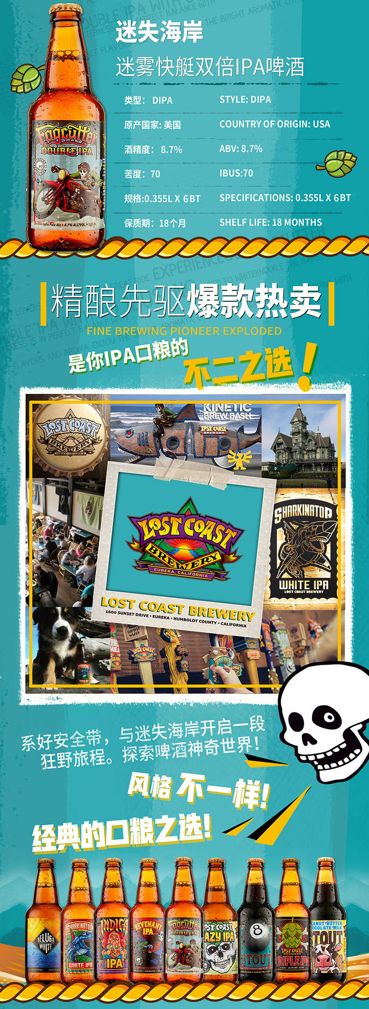 国产/进口:进口;产地:美国;适用场景:家庭聚会,自斟自饮,派对必备,烧烤撸串,酒吧夜店;包装:组合装;容量:331-499mL;类别:精酿;原料:水、麦芽、啤酒花、酵母;保质期:18个月;酒精度:8.7% vol;原产地:美国;原麦汁浓度:18°P;存储方法:存放于阴凉干燥处,请勿倒置,冰镇后饮用更佳;容量:355ml;产品重量:3.56kg;包装清单:迷失海岸 (LOST COAST) 迷雾快艇双倍IPA啤酒 355ml*6瓶;
