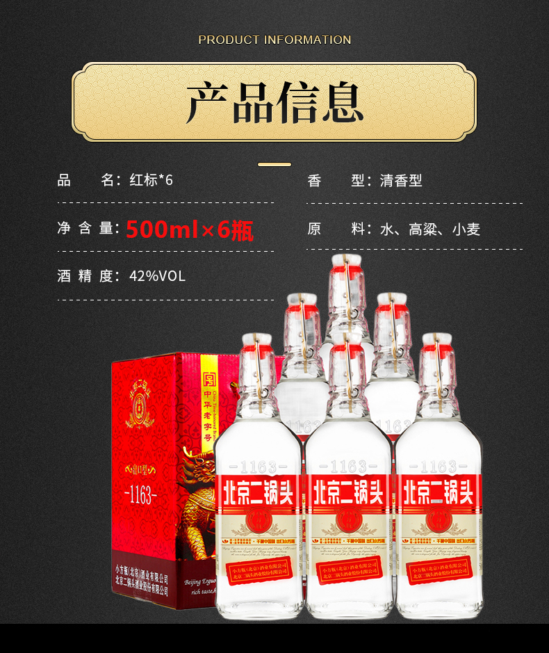 包装:礼盒装;容量:376-499mL;香型:清香型;度数:40-49度;产地:北京;酒精度:42%vol;产品重量:500g;容量:500ml;包装清单:永丰牌北京二锅头红标500ml*6;
