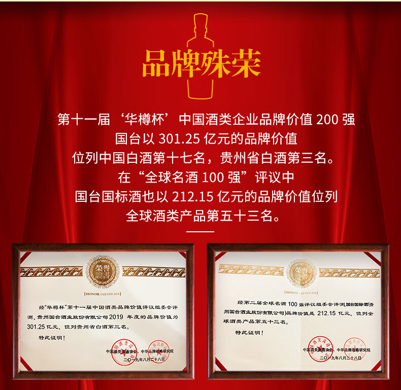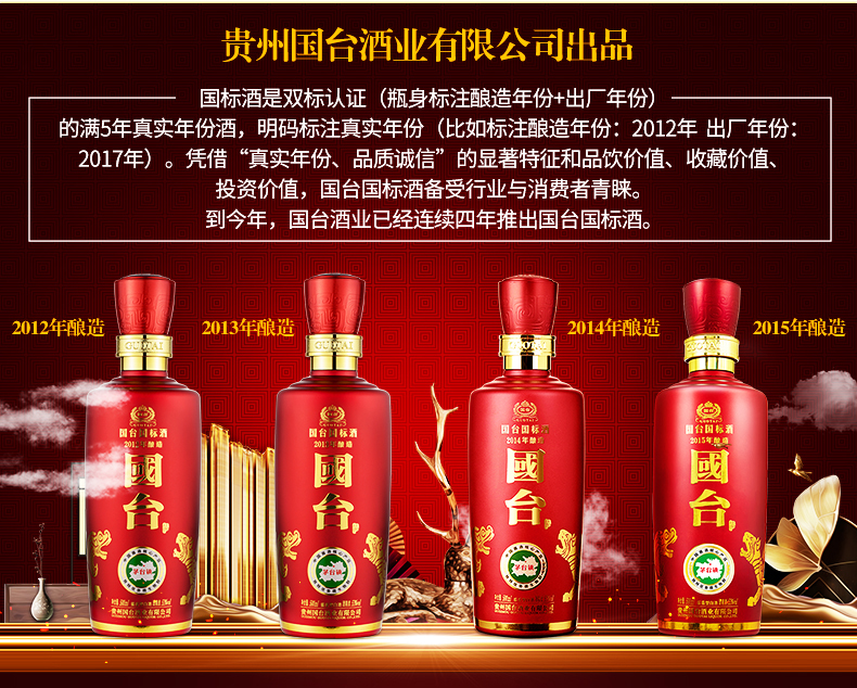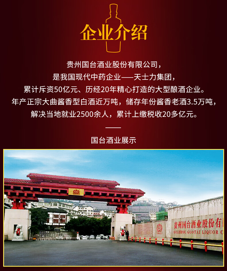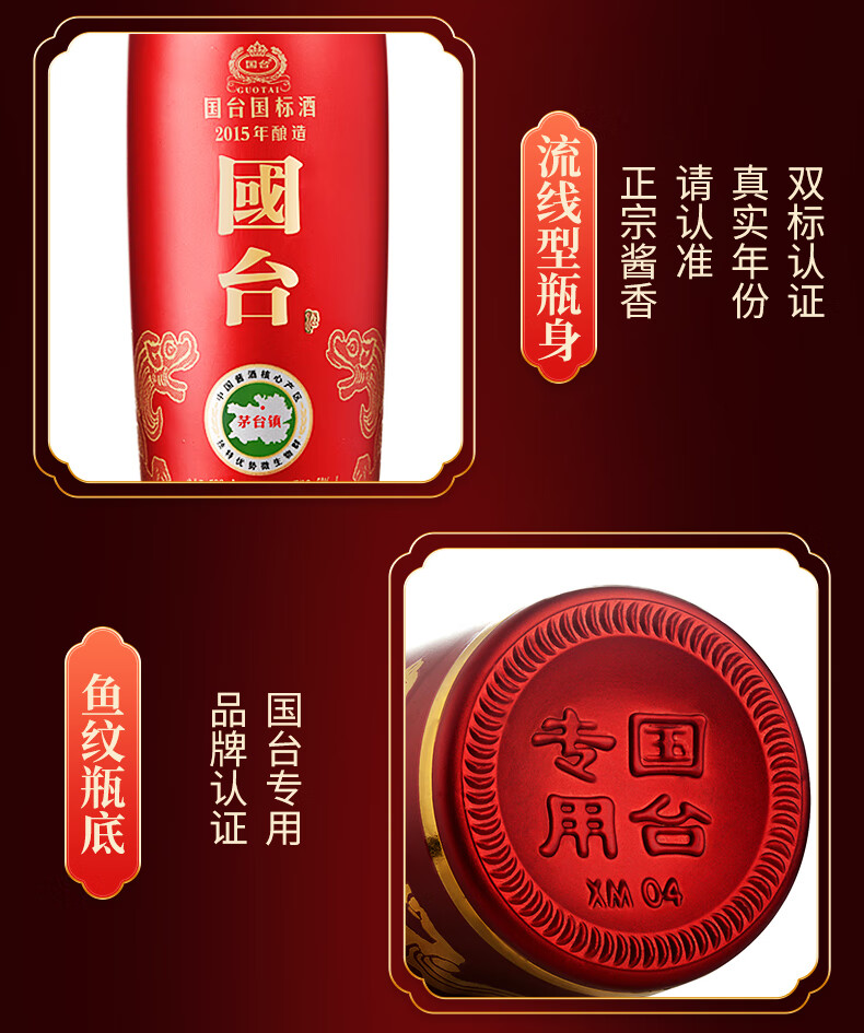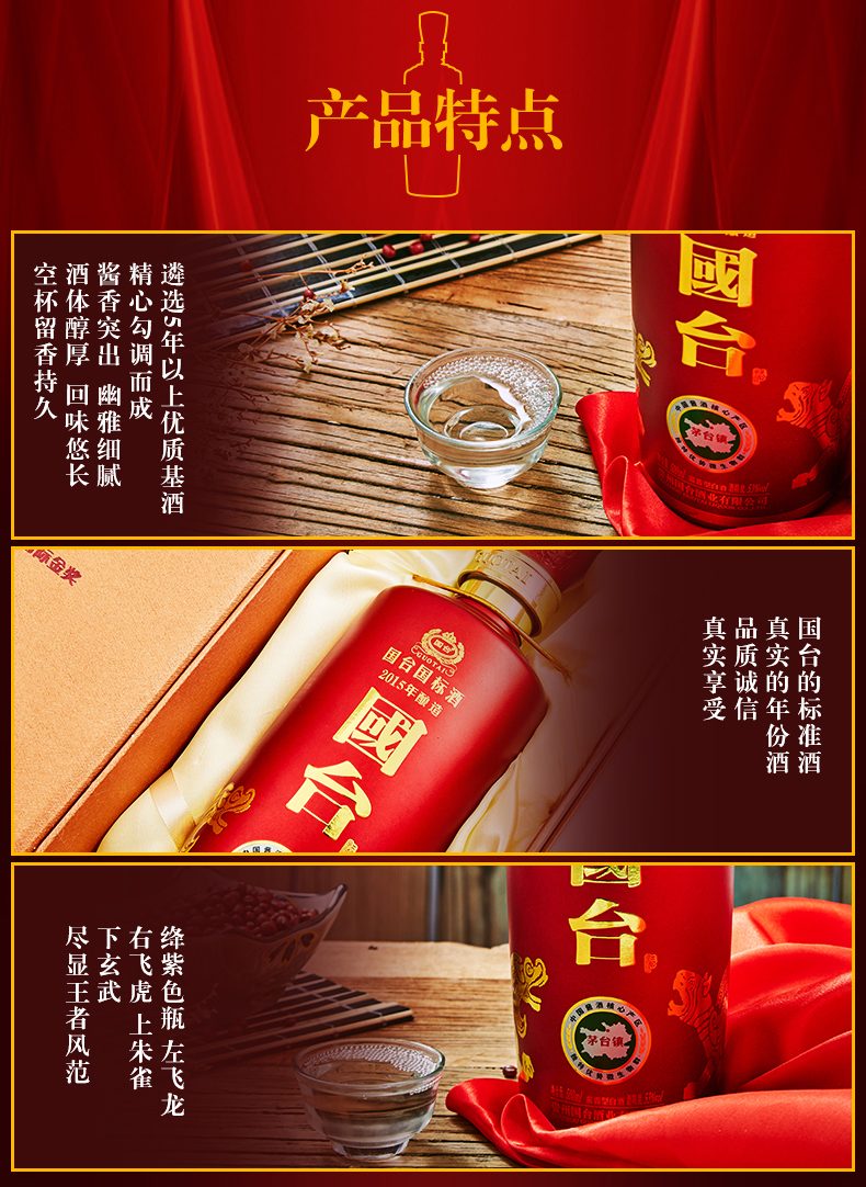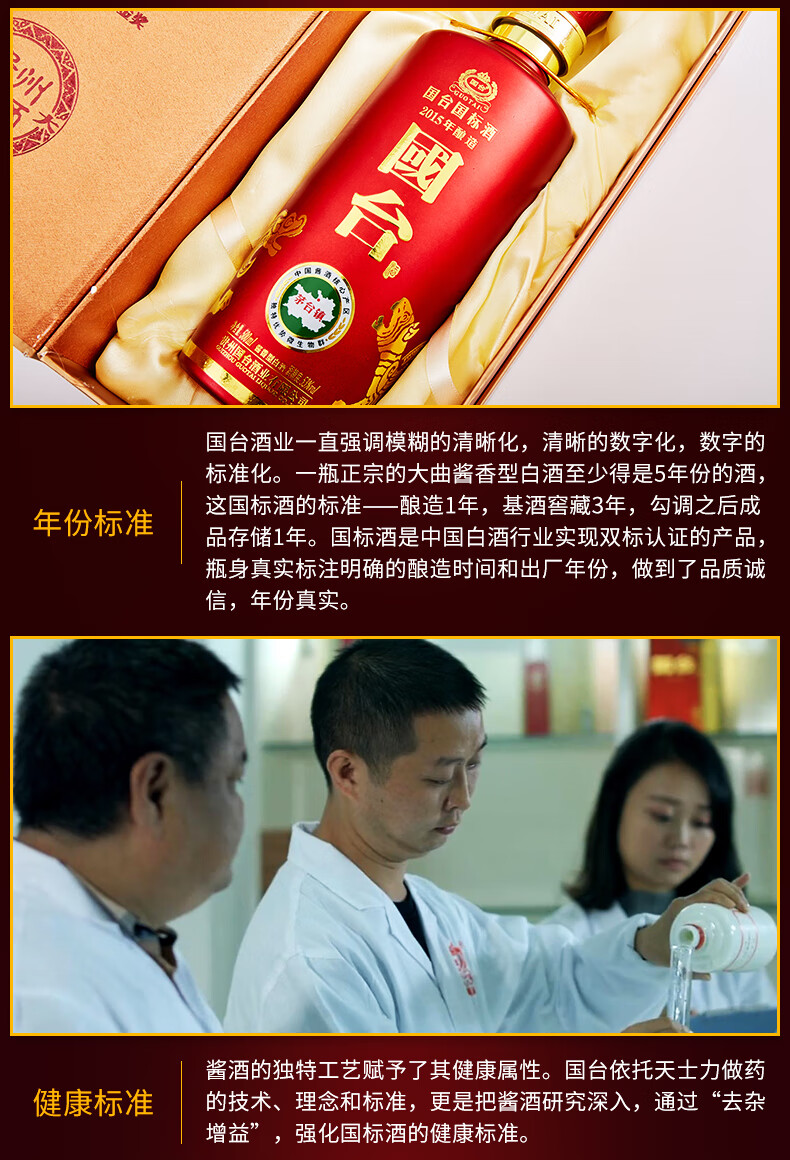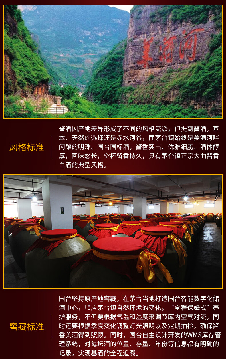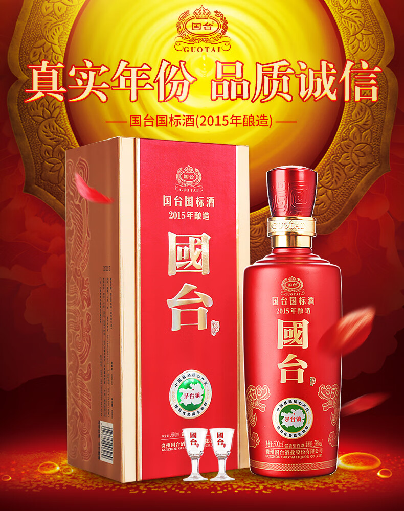 包装:整箱装;容量:500-749mL;香型:酱香型;产地:贵州;度数:50度及以上;酒精度:53%vol;容量:500ml;产品重量:9000g;包装清单:国台 国标酒 53度 500ml*6瓶整箱装;
