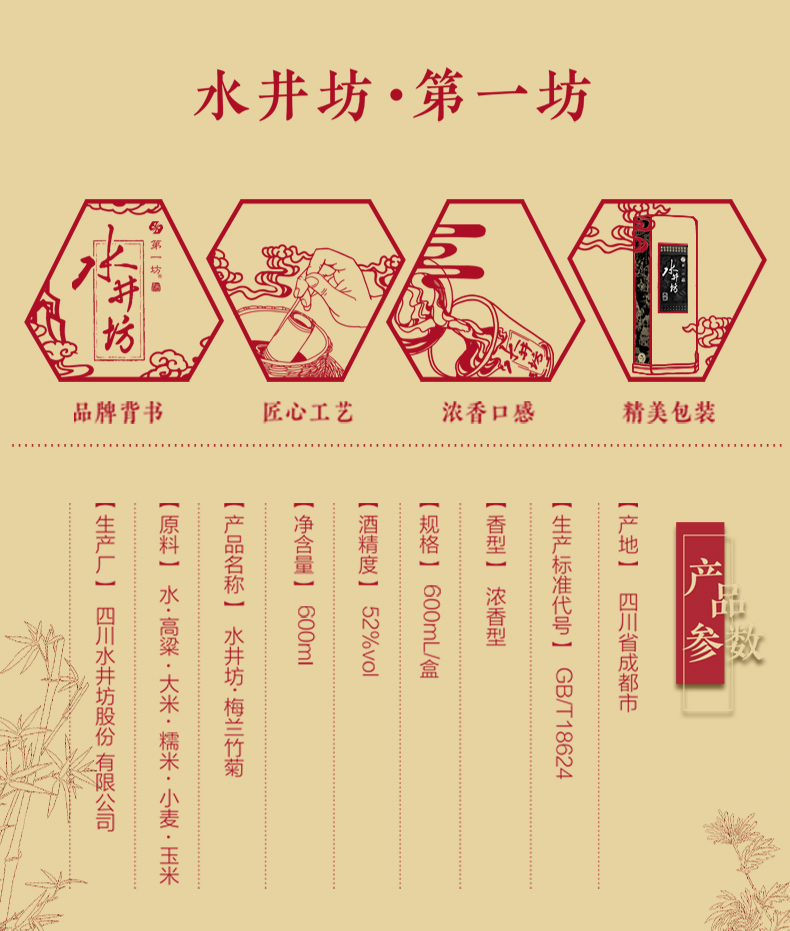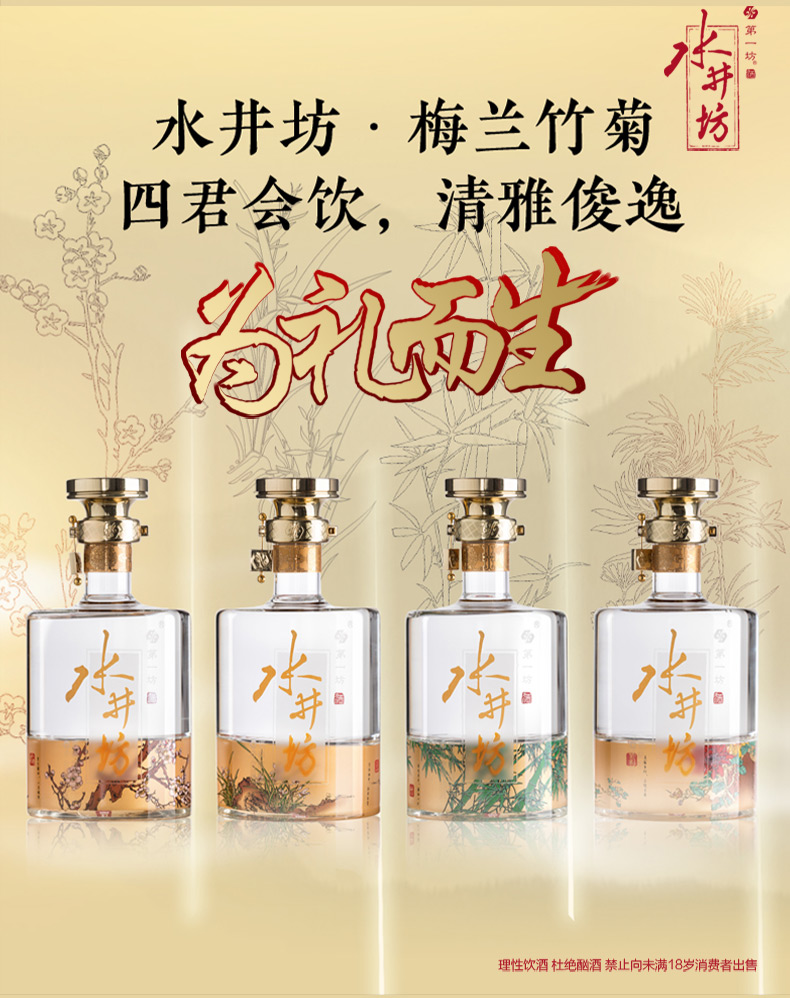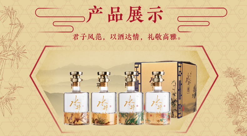 包装:礼盒装;容量:500-749mL;香型:浓香型;产地:四川;度数:50度及以上;酒精度:52%vol;容量:600;产品重量:6760g;包装清单:水井坊 梅兰竹菊 52度 600ml*4瓶;