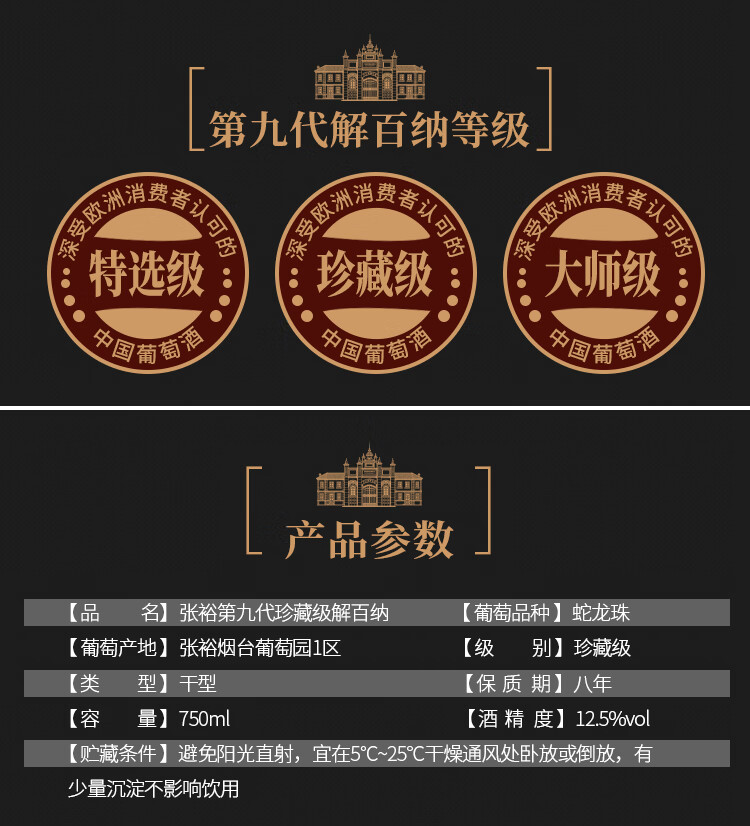 张裕 第九代珍藏级解百纳 蛇龙珠干红葡萄酒 750ml 礼盒装