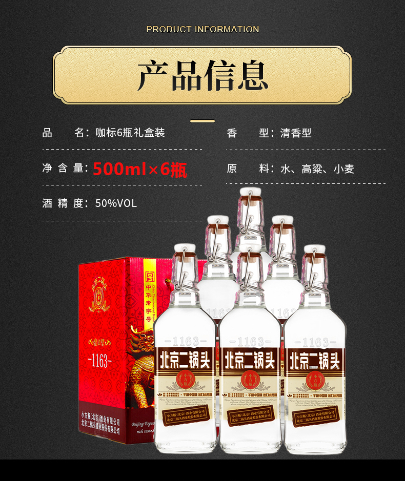 包装:礼盒装;容量:376-499mL;香型:清香型;度数:50度及以上;产地:北京;酒精度:50%vol;产品重量:500g;容量:500ml;包装清单:永丰牌北京二锅头咖标500ml*6;
