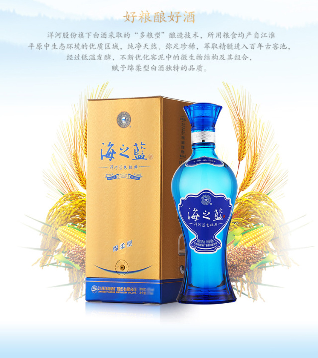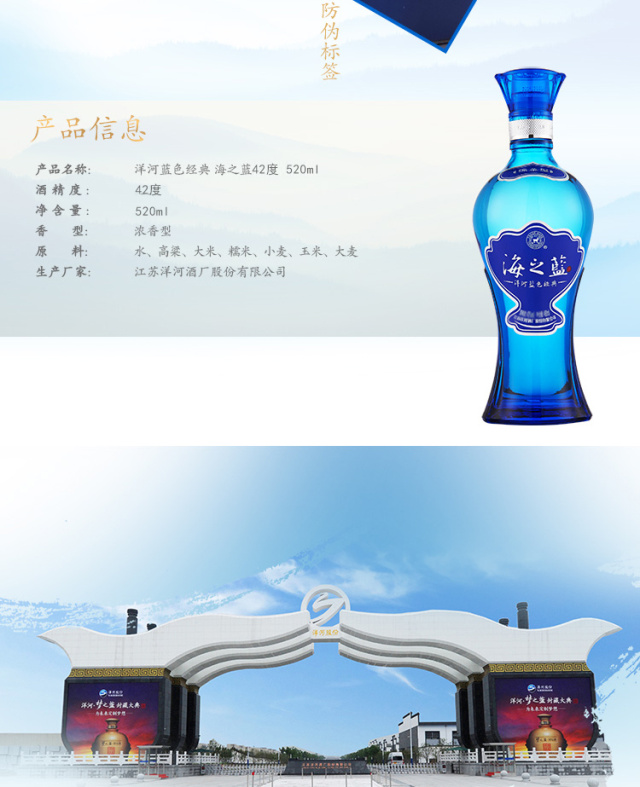 包装:瓶装;容量:500-749mL;香型:浓香型;度数:40-49度;香型:浓香型;产地:江苏;酒精度:42;包装:瓶装;产品重量:0g;容量:520;包装清单:洋河蓝色经典 海之蓝 42度 520ml*1瓶;