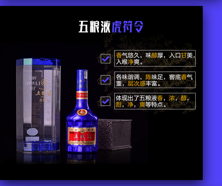 包装:整箱装;容量:376-499mL;香型:浓香型;度数:50度以上;容量:500ml;产品重量(kg):3;包装:整箱;存储方法:避免阳光直射;酒精度:52度;香型:浓香型;等级:优级;省份:四川;包装清单:五粮液 52度 虎符令 500ML*6瓶 整箱装;