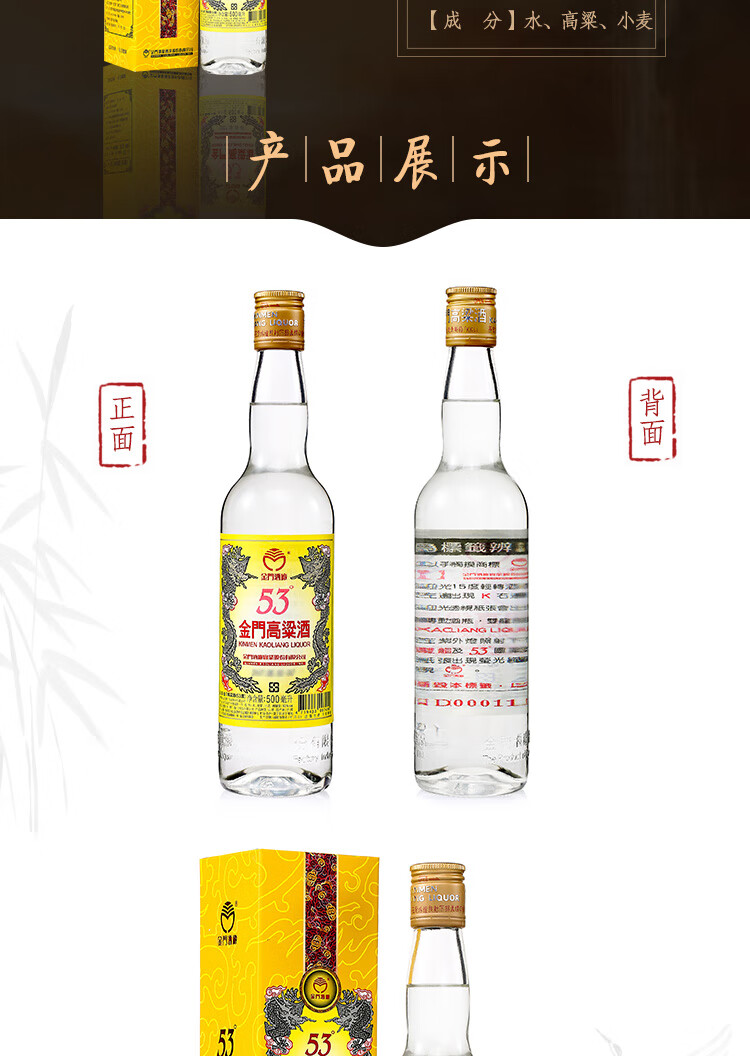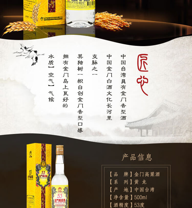 包装:整箱装;容量:500-749mL;香型:其它;产地:中国台湾;度数:50度及以上;酒精度:53%vol;容量:500ml*6;产品重量:6800g;包装清单:金门高粱53度黄金龙500ml×6瓶整箱装×1 ,( 箱内配礼品袋×6个);