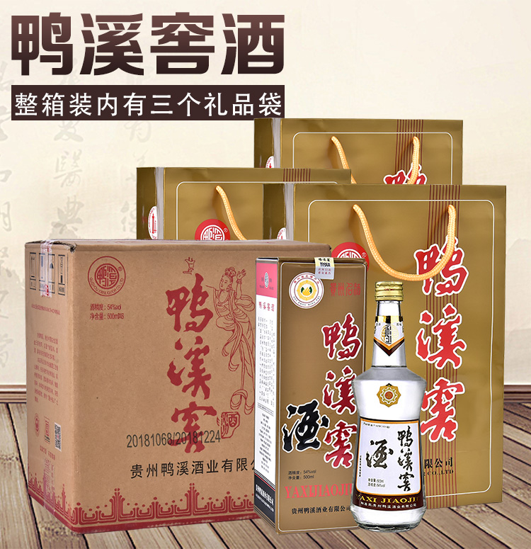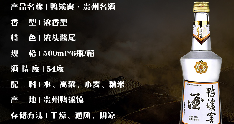 包装:整箱装;容量:376-499mL;香型:浓香型;产地:贵州;度数:50度及以上;酒精度:54%vol;容量:500;产品重量:6.72g;包装清单:鸭溪 鸭溪54°鸭溪窖500ml*6 l浓香型白酒;