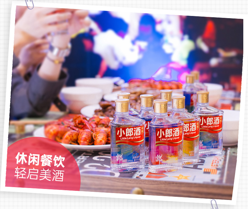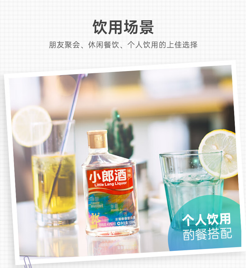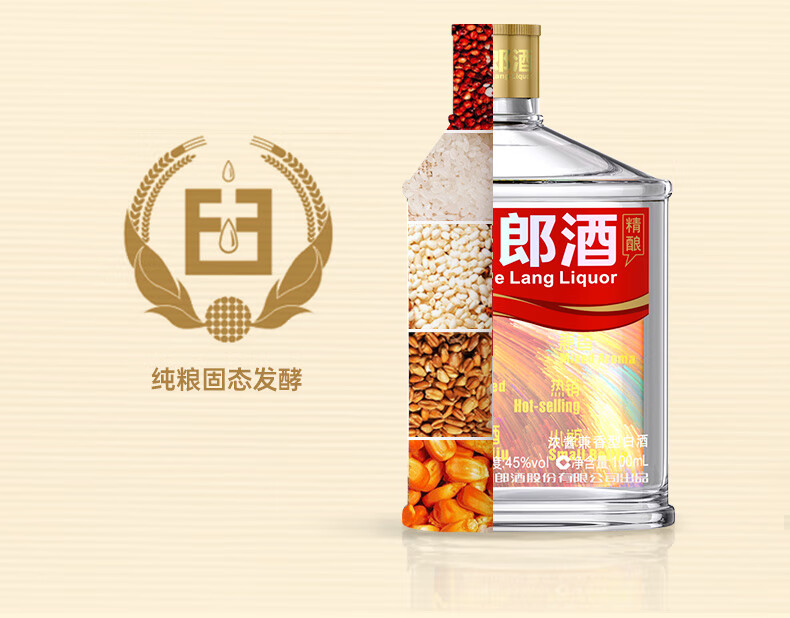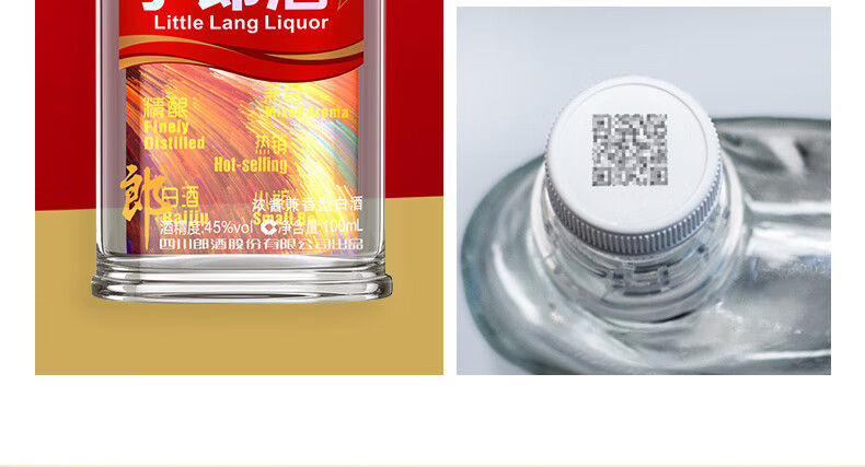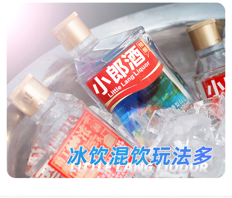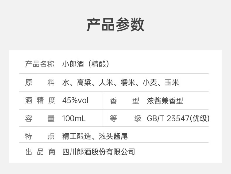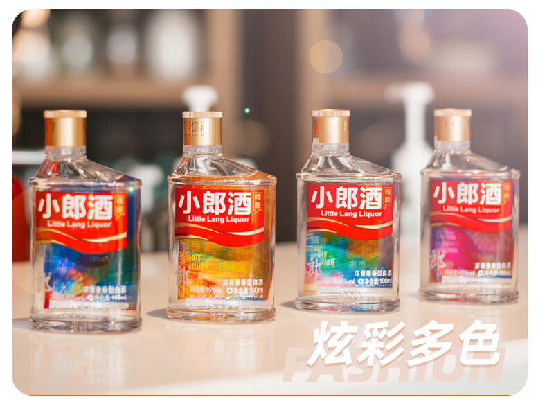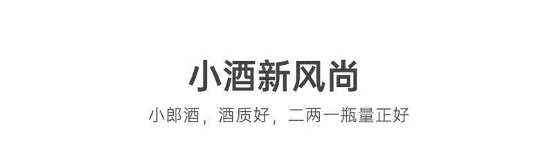 包装:整箱装;容量:375mL及以下;香型:兼香型;产地:四川;度数:40-49度;酒精度:45%vol;容量:100ml*24;产品重量:7570g;包装清单:郎酒 小郎酒 炫彩小瓶 45度 100ml*24瓶;