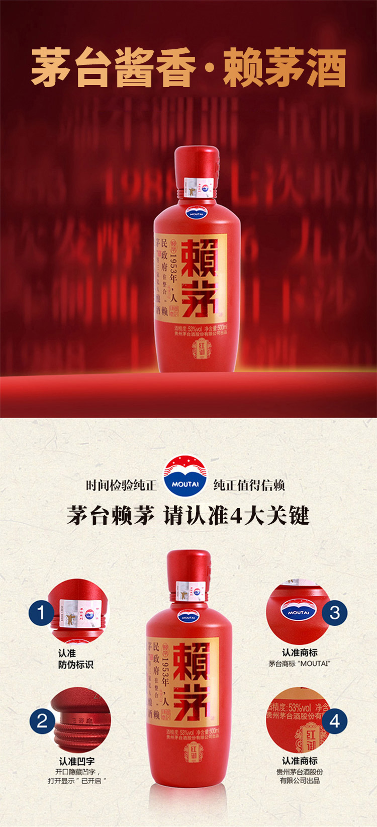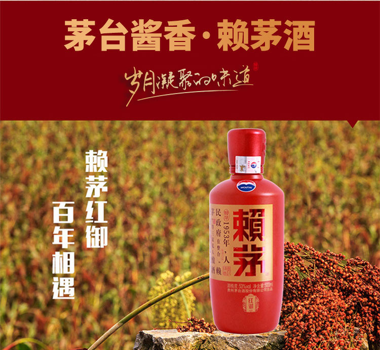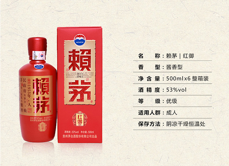 包装:整箱装;容量:376-499mL;香型:酱香型;度数:50度及以上;产地:贵州;酒精度:53%vol;产品重量:0g;容量:500;包装清单:茅台 赖茅 红御 酱香型 白酒 53度 500ml*6 整箱装;