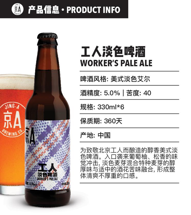 国产/进口:国产;产地:中国大陆;适用场景:家庭聚会,礼节拜访,情侣约会,自斟自饮,派对必备,酒吧夜店;包装:组合装;容量:330mL;类别:精酿;原料:水,大麦芽, 啤酒花,酵母;国产/进口:国产;保质期:360天;酒精度:≥5%;原产地:中国大陆;原麦汁浓度:12.5°P;存储方法:5-25℃,避光贮运;类别:精酿;包装:组合装;产品重量(kg):3.5;容量:330ml;包装清单:京A 工人淡色啤酒美式淡色艾尔Worker's Pale Ale(瓶装)6支装;