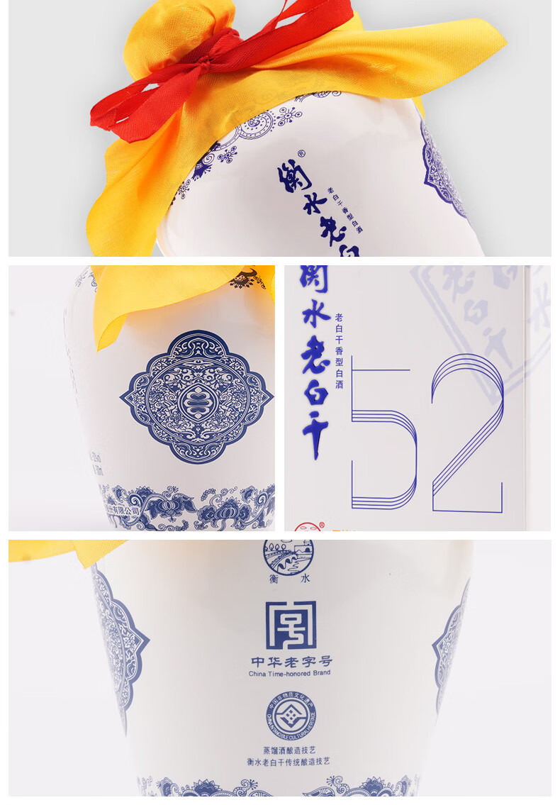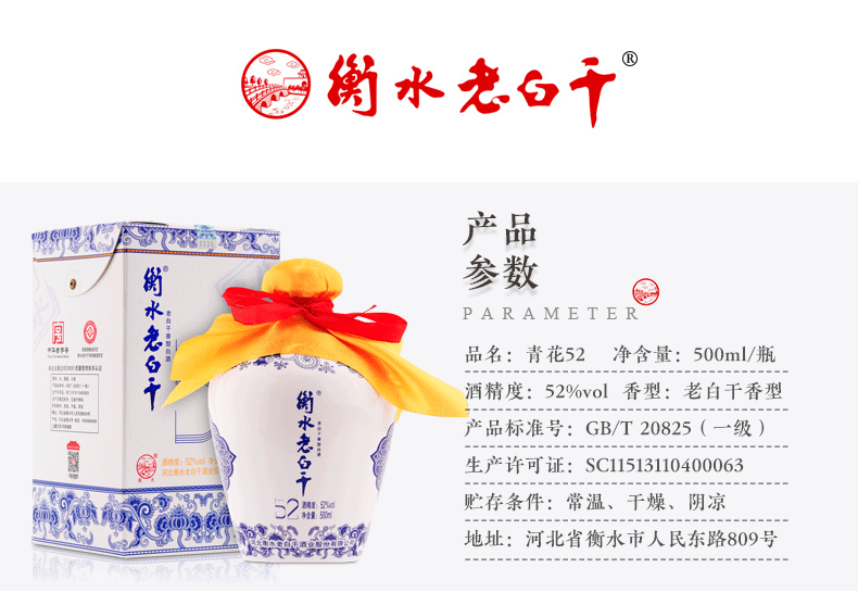 包装:礼盒装;容量:500-749mL;香型:老白干香型;度数:50度及以上;香型:老白干香型;产地:河北;酒精度:52%vol;包装:礼盒装;容量:500ml;产品重量:1070g;包装清单:衡水老白干 白酒 青花 52度 500ml*1瓶;