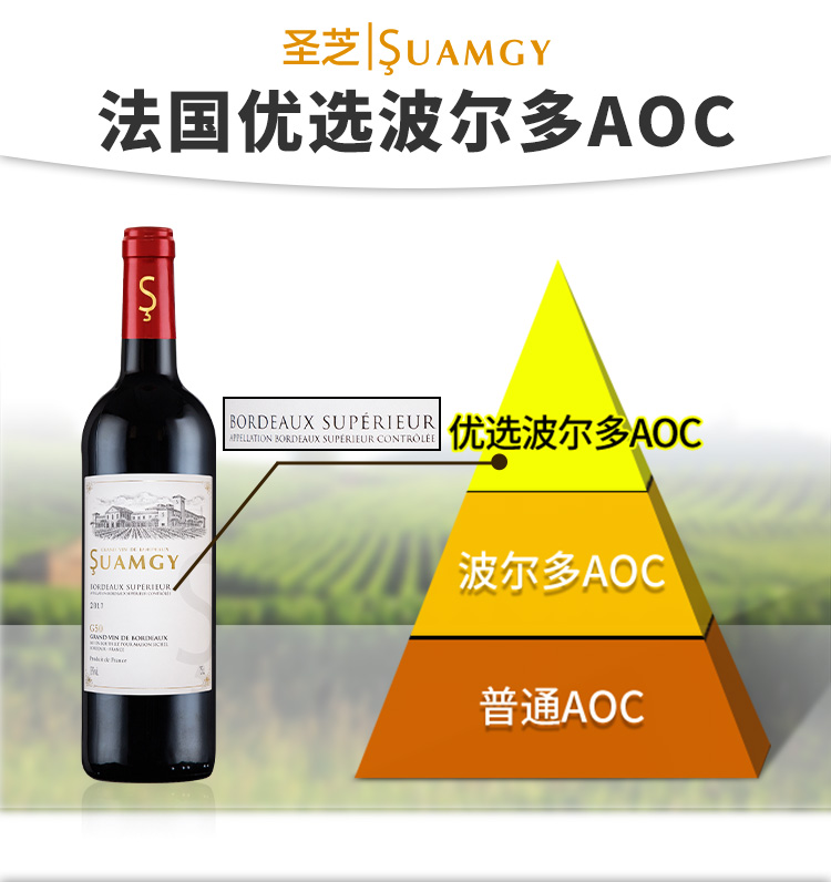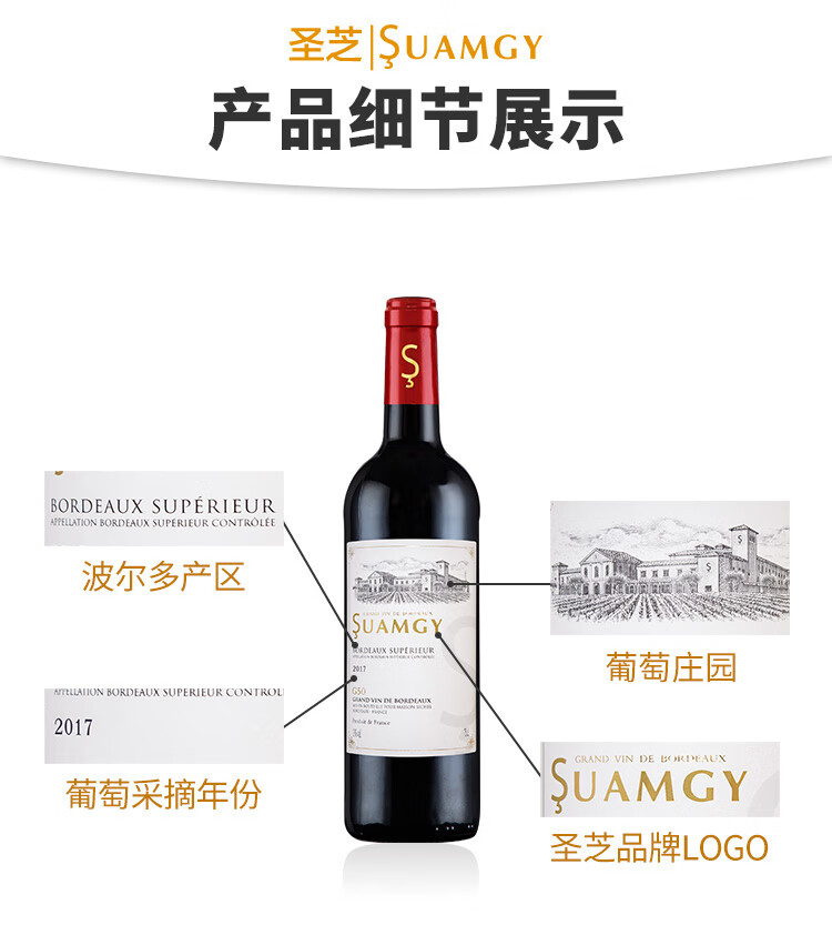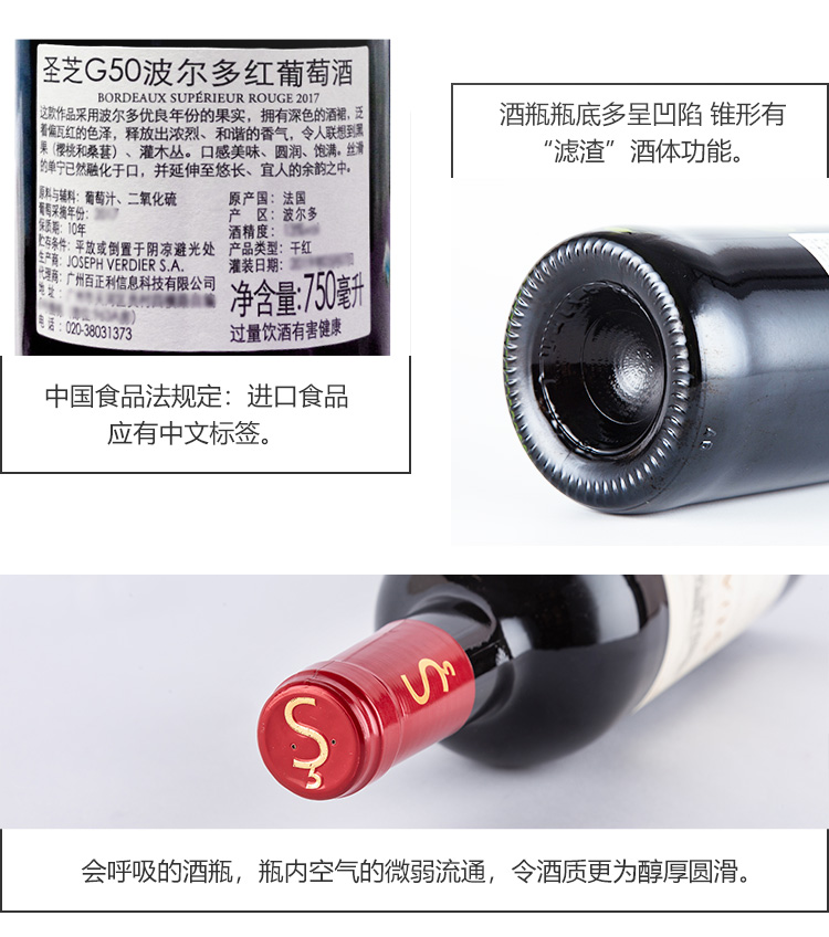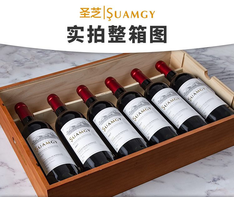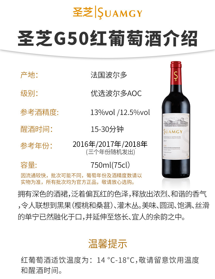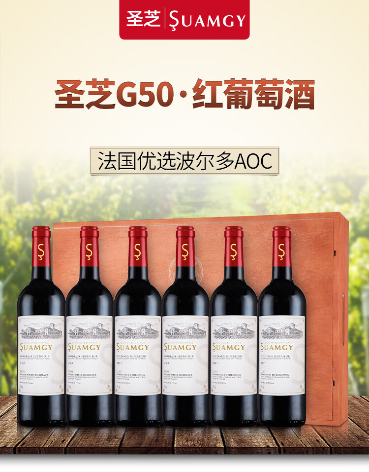 颜色:宝石红;口感:饱满;特性:法定产区酒(AOC/AOP等);国产/进口:进口;适用场景:礼节拜访,商务宴请;包装:整箱装;酸度:中酸;类别:红葡萄酒;葡萄品种:赤霞珠(Cabernet Sauvignon),梅洛(Merlot);类型:静止酒;香型:花香,果香;产地:法国;容量:750mL;甜度:干型;保质期:10年;酒精度:13%vol、12.5%vol;原产地:法国;存储方法:平放于阴凉避光处;产品重量:9.45kg;容量:750ml;包装清单:圣芝G50波尔多红葡萄酒*6,定制木箱*1;