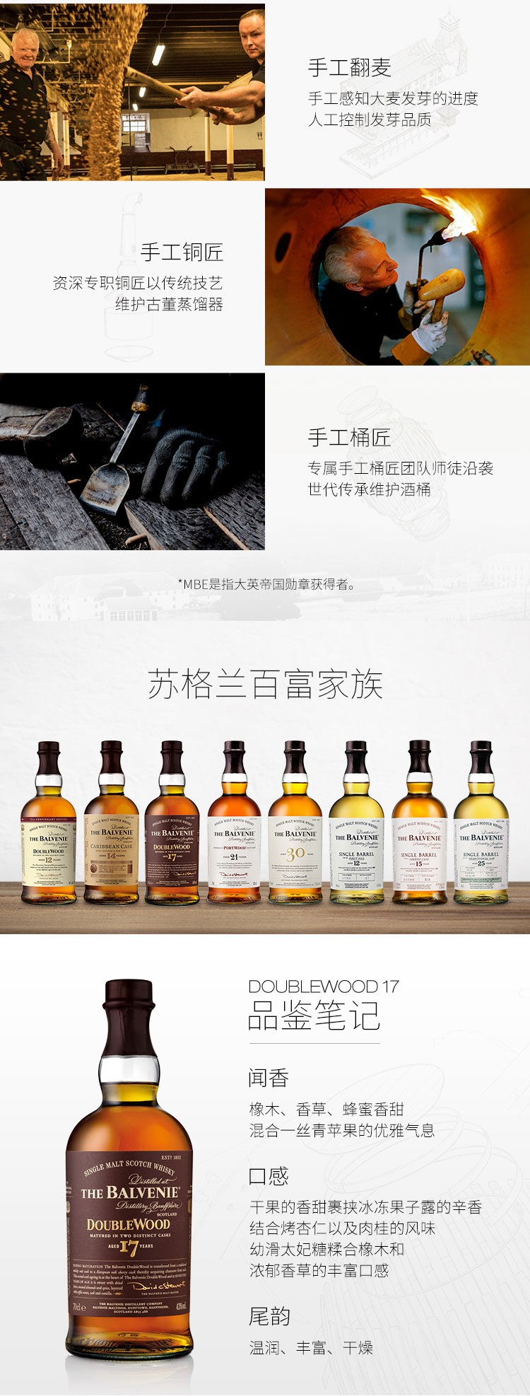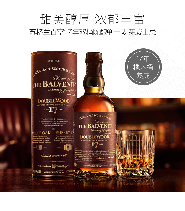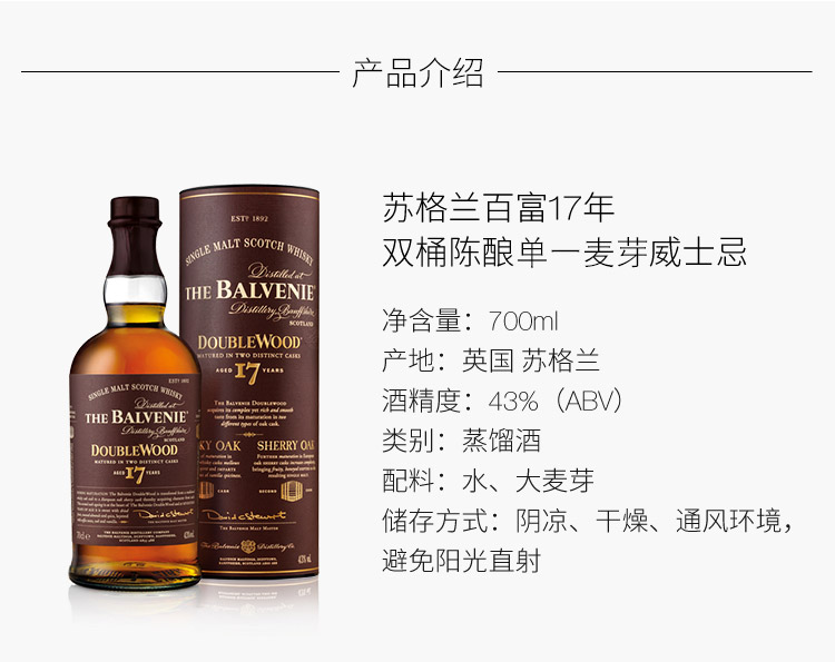 类型:单一麦芽威士忌;产地:苏格兰;适用场景:自斟自饮,亲友馈赠,家庭聚会,商务宴请,情侣约会;包装:瓶装;容量:700-999mL;阶段:挑剔味蕾;酒精度:43%vol;原料:水、大麦芽;保质期:无;存储方法:常温避光保存;容量:700ml;产品重量(kg):1.38;包装清单:苏格兰百富(The Balvenie)洋酒 百富17年 双桶陈酿单一麦芽苏格兰威士忌700ml *1;