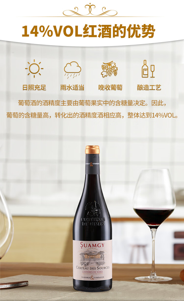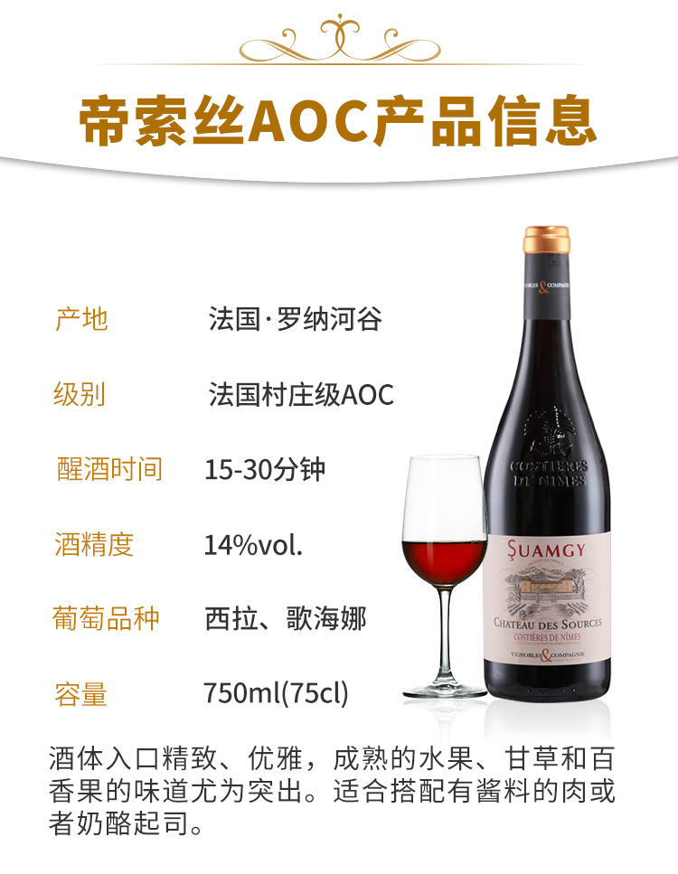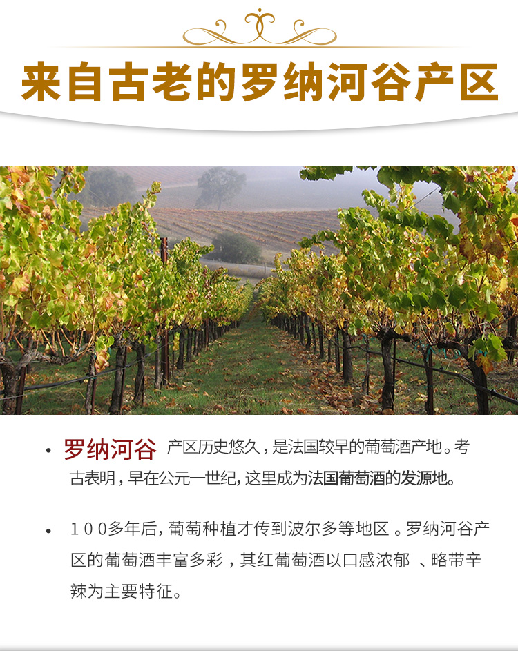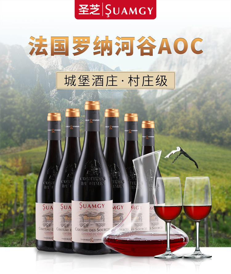颜色:宝石红;口感:饱满;特性:法定产区酒(AOC/AOP等);国产/进口:进口;适用场景:家庭聚会,礼节拜访,商务宴请,婚礼婚宴,情侣约会,自斟自饮,闺蜜私语,派对活动;包装:整箱装;酸度:中酸;类别:红葡萄酒;葡萄品种:西拉/设拉子(Syrah/Shiraz),歌海娜(Grenache);类型:静止酒;香型:花香,果香;产地:法国;容量:750mL;甜度:干型;保质期:10年;酒精度:14%vol;原产地:法国;存储方法:恒温、静卧、斜放、避光;容量:750ml;产品重量:10kg;包装清单:圣芝罗纳河谷干红葡萄酒750ml*6,圆形醒酒器*1,红酒杯*2,海马刀*1;;