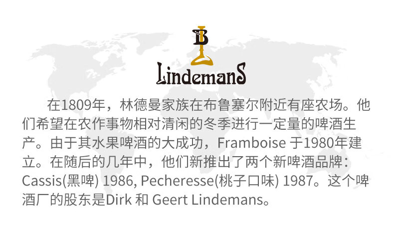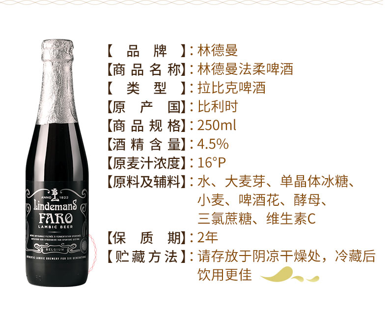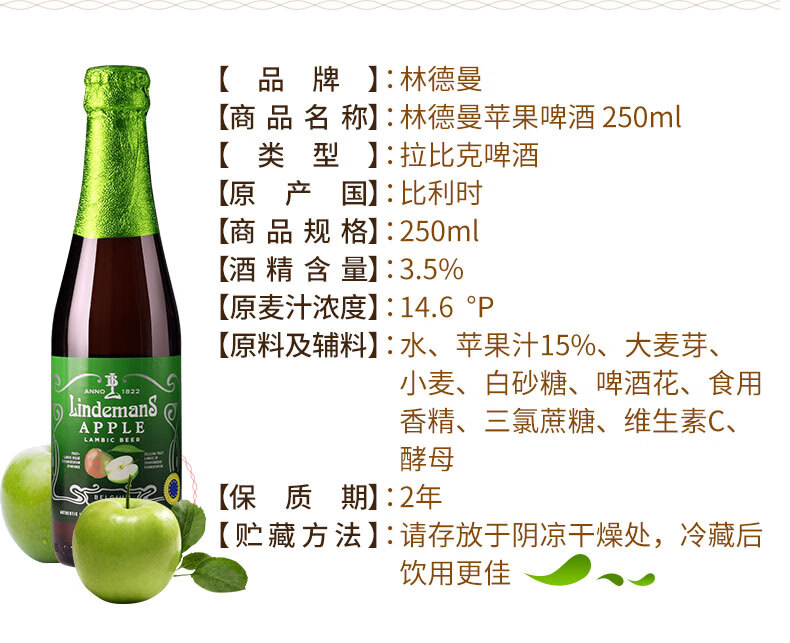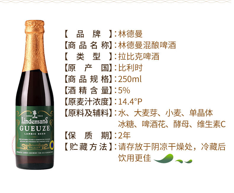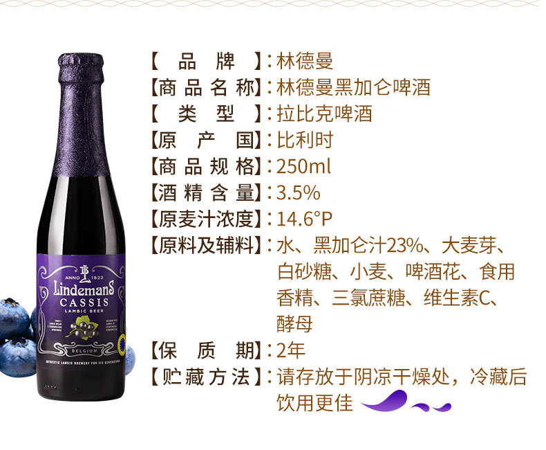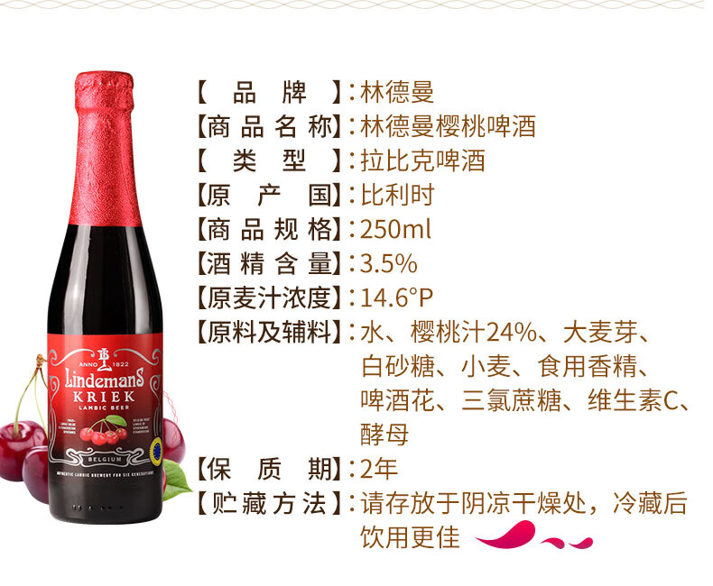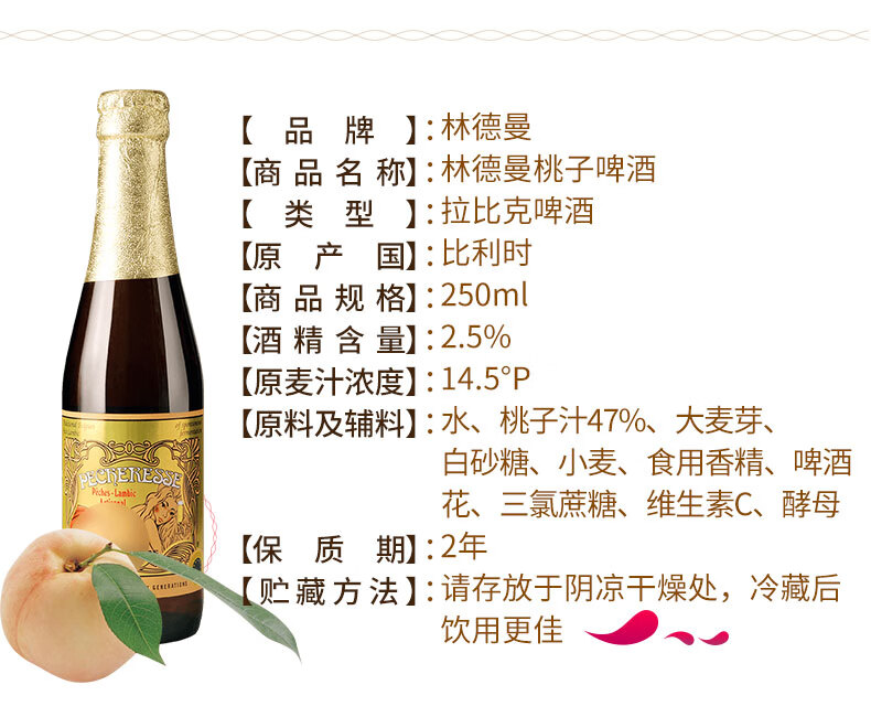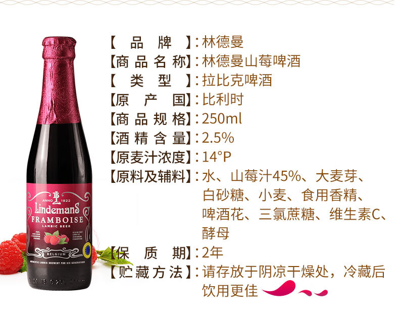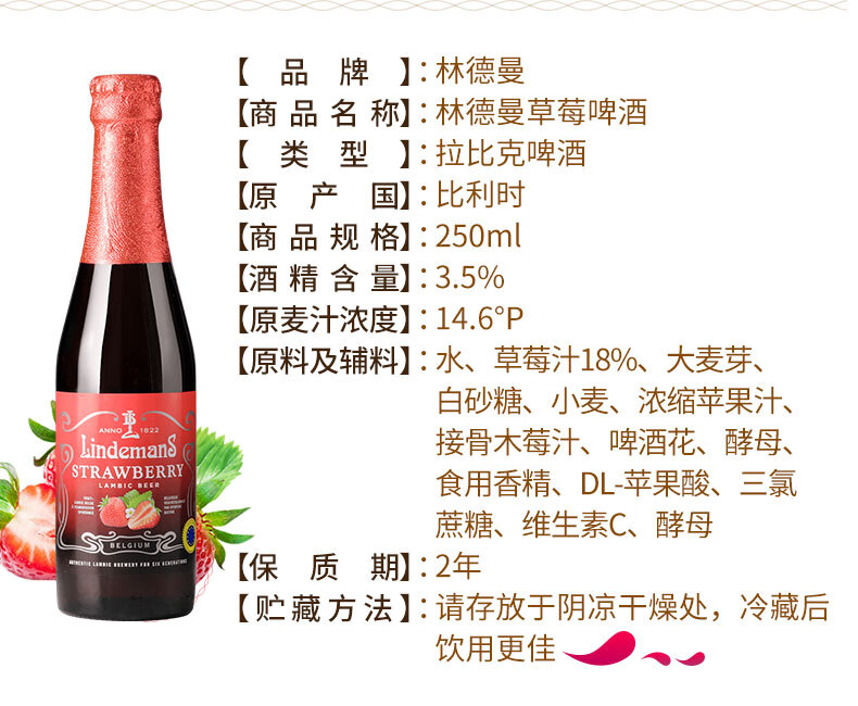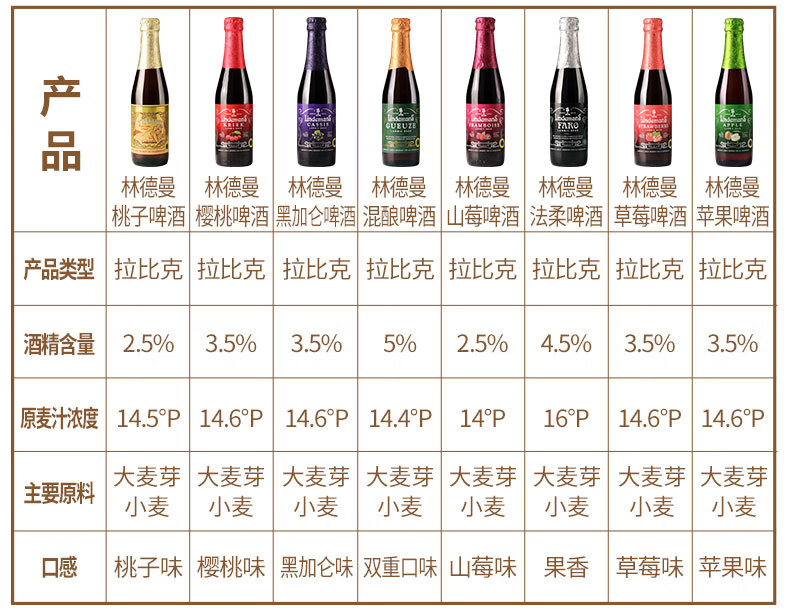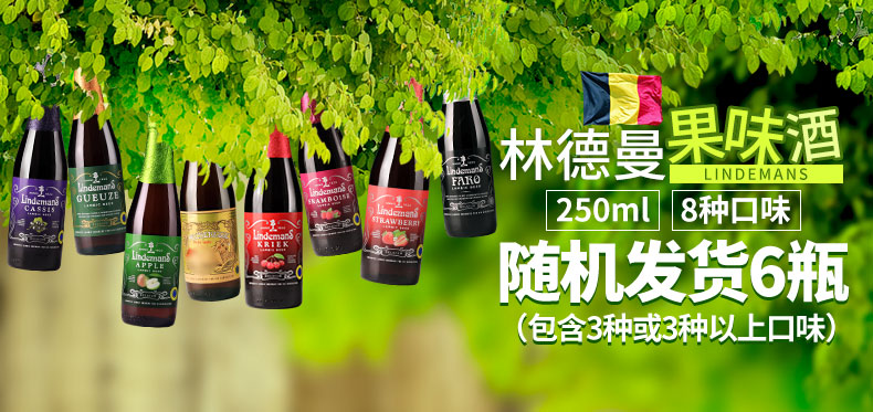 国产/进口:进口;产地:比利时;适用场景:礼节拜访,家庭聚会,自斟自饮,情侣约会,烧烤撸串,派对必备,酒吧夜店;包装:组合装;容量:330mL以下;类别:精酿;原料:水、桃子汁47%/山莓汁45%/樱桃汁24%/黑加仑汁23%/苹果汁15%/草莓汁18%、、大麦芽、白砂糖、小麦、 食用香精、 啤酒花、三氯蔗糖、维生素C、酵母;保质期:2年;酒精度:2.5%vol~5%vol;原产地:比利时;原麦汁浓度:14°P~16°P;存储方法:请存放于阴凉干燥处,冷藏后饮用更佳;产品重量:3.5kg;容量:250ml;包装清单:Lindemans 林德曼啤酒 组合装250ml*6瓶x1;