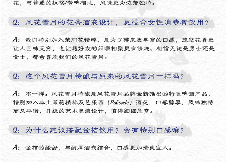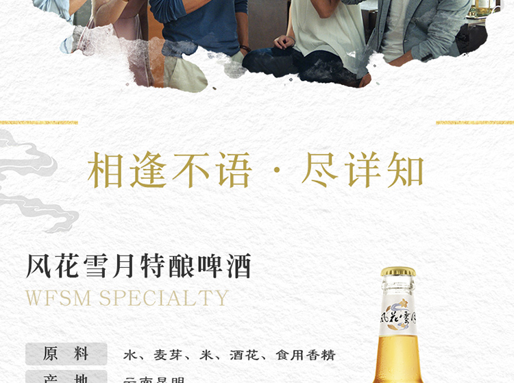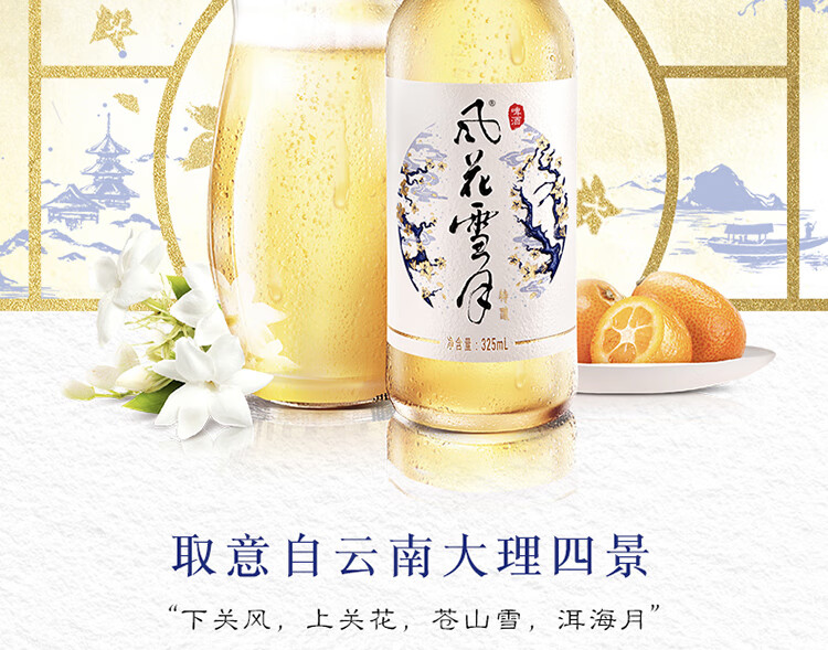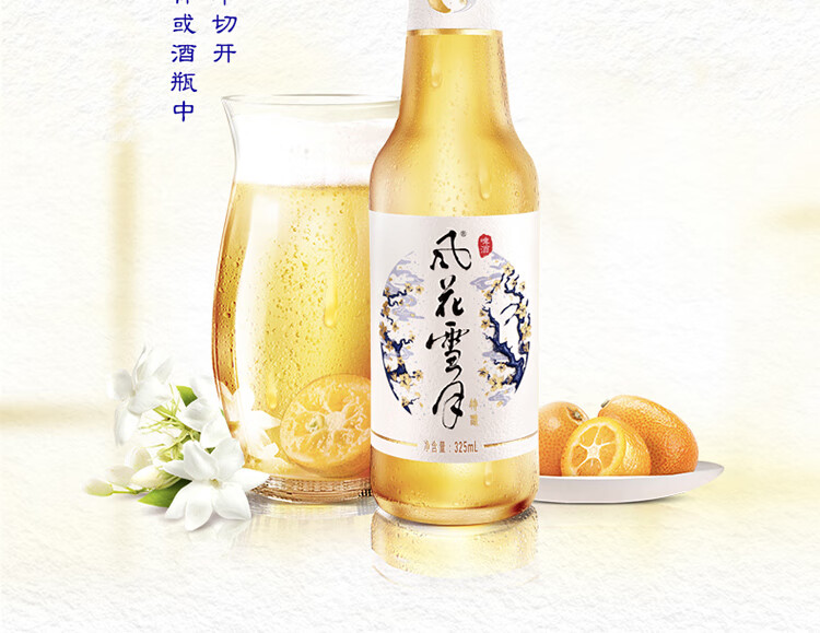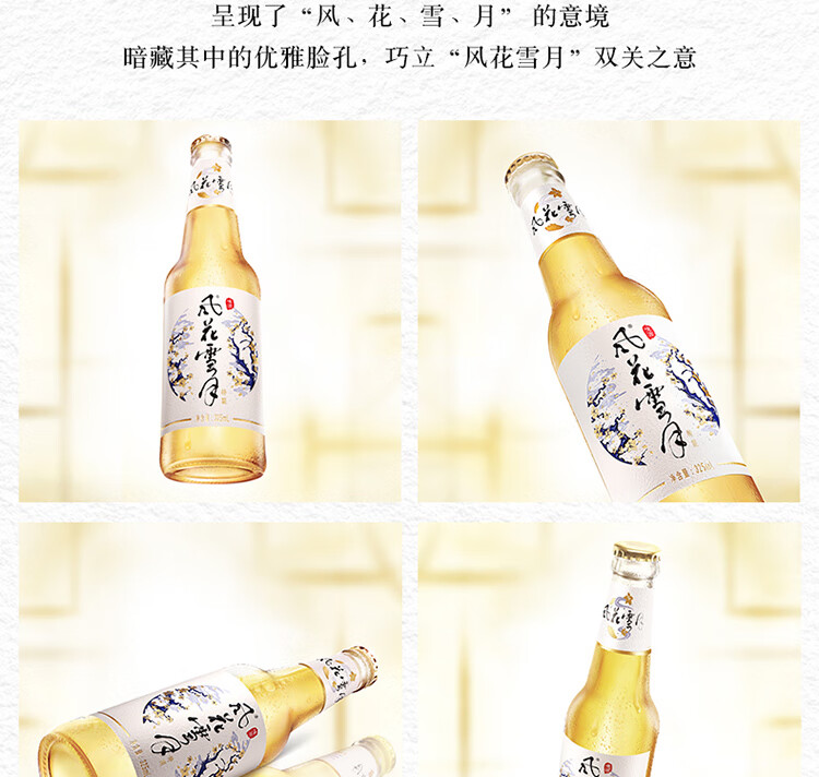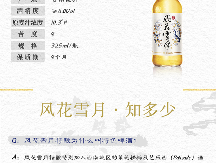 国产/进口:国产;产地:中国大陆;适用场景:家庭聚会,礼节拜访,情侣约会,自斟自饮,派对必备,烧烤撸串,酒吧夜店;包装:瓶装;容量:330mL以下;类别:黄啤酒;原料:水, 麦芽,啤酒花;国产/进口:国产;保质期:9个月;酒精度:4;原产地:中国大陆;原麦汁浓度:10.3;存储方法:阴凉,通风;类别:黄啤酒;包装:瓶装;容量:325mL;产品重量:8.5kg;包装清单:风花雪月啤酒 特酿啤酒325ml*24瓶 整箱装;