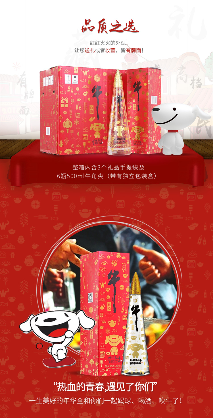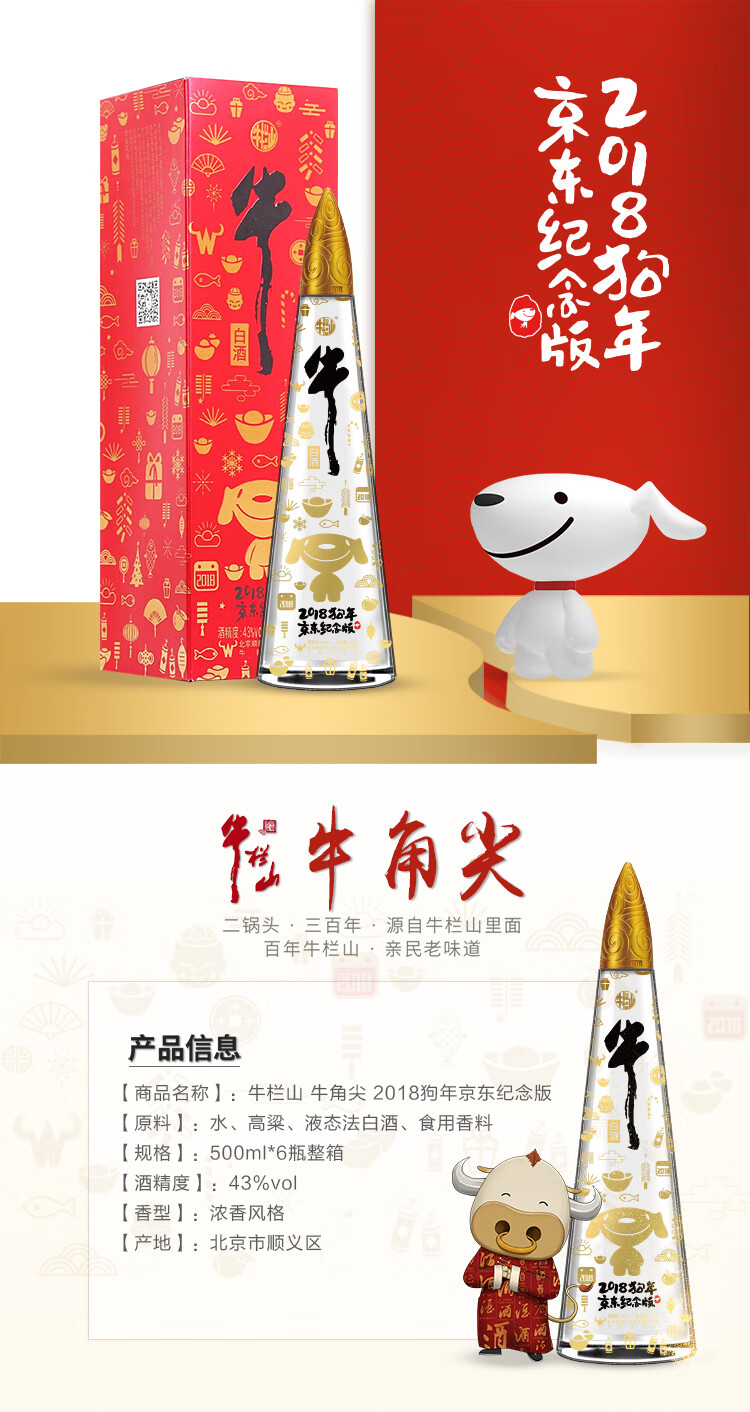 包装:整箱装;容量:376-499mL;香型:浓香型;度数:40-49度;香型:浓香型;产地:北京;酒精度:43%vol;包装:礼盒装;产品重量:6.92g;容量:500ml;包装清单:牛栏山 牛角尖 2018狗年京东纪念版 43度 500ml*6瓶 整箱装 浓香风格白酒(内含三个礼品袋))*1;