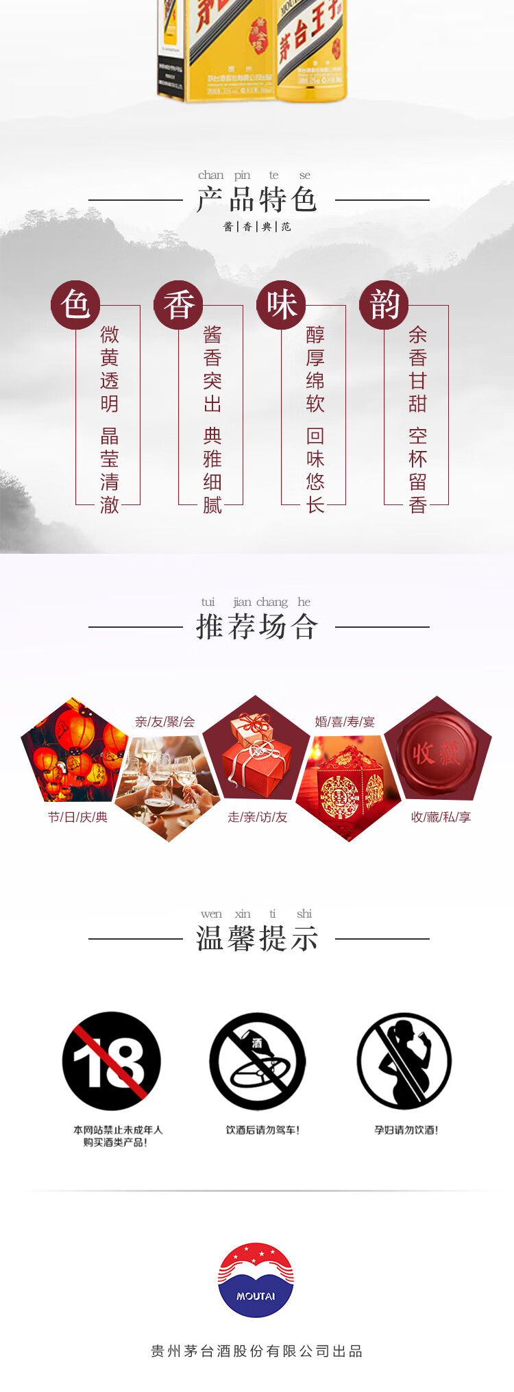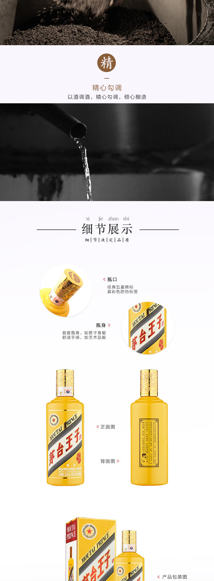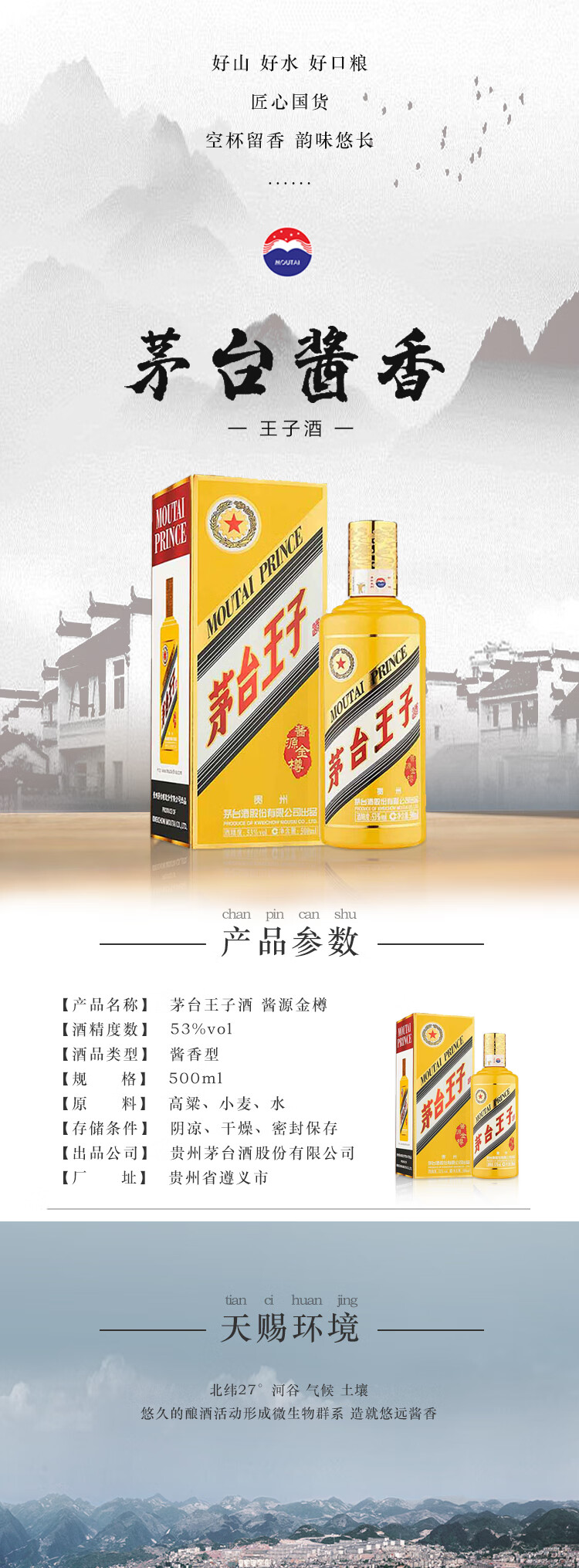 包装:整箱装;容量:500-749mL;香型:酱香型;产地:贵州;度数:50度及以上;酒精度:53%vol;容量:500ml;产品重量:8385g;包装清单:茅台 MOUTAI 53度酱香型白酒 王子酱源金樽 500ml*6瓶 整箱装;