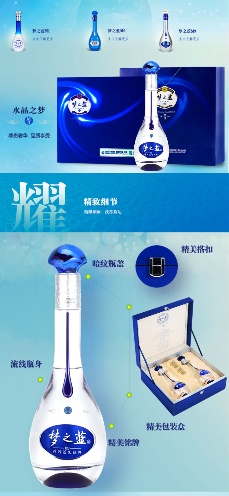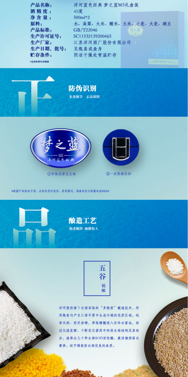 包装:礼盒装;容量:376-499mL;香型:浓香型;产地:江苏;度数:40-49度;酒精度:45%vol;容量:500;产品重量:0g;包装清单:梦之蓝M3 45度 礼盒装500ml*2瓶白酒*1;