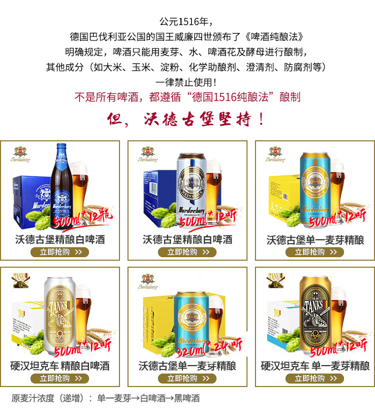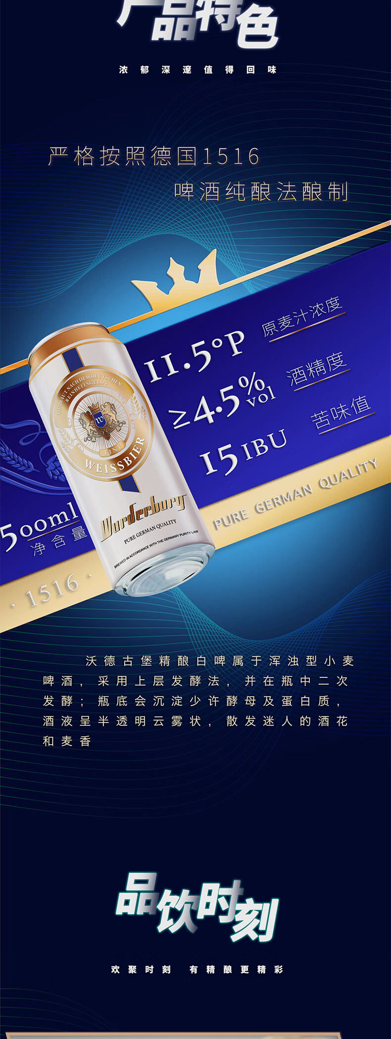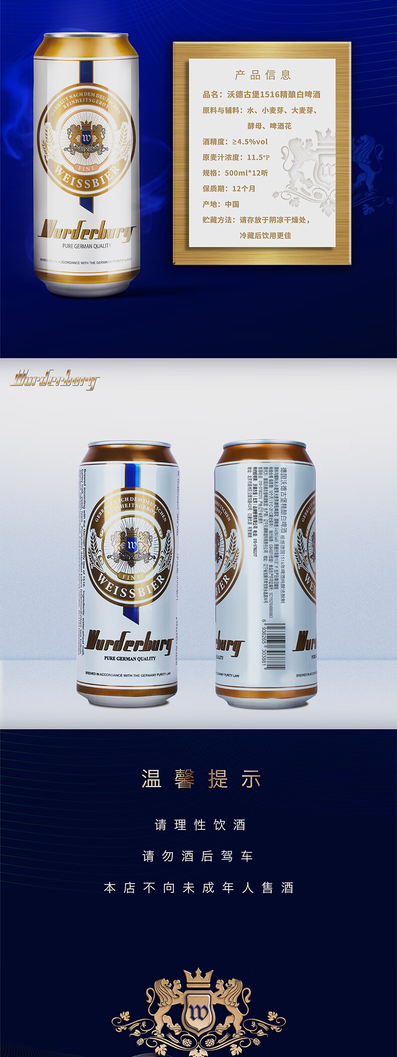 国产/进口:国产;产地:中国大陆;适用场景:礼节拜访,家庭聚会,自斟自饮,情侣约会,烧烤撸串,派对必备,酒吧夜店;包装:组合装;容量:500mL;类别:精酿;原料:水,小麦芽,大麦芽,酵母,啤酒花;保质期:365天;酒精度:4.5;原产地:中国大陆;原麦汁浓度:11.5°P;存储方法:避光保存;容量:500ml;产品重量:0.5kg;包装清单:沃德古堡 wurderburg 德国工艺 精酿白啤酒听装 500ml*12听;
