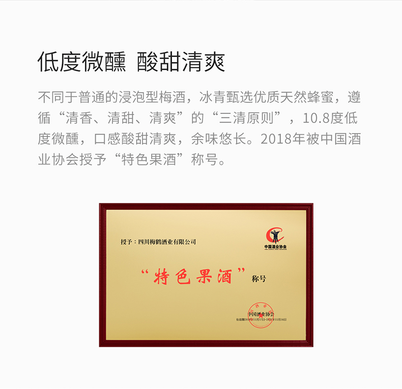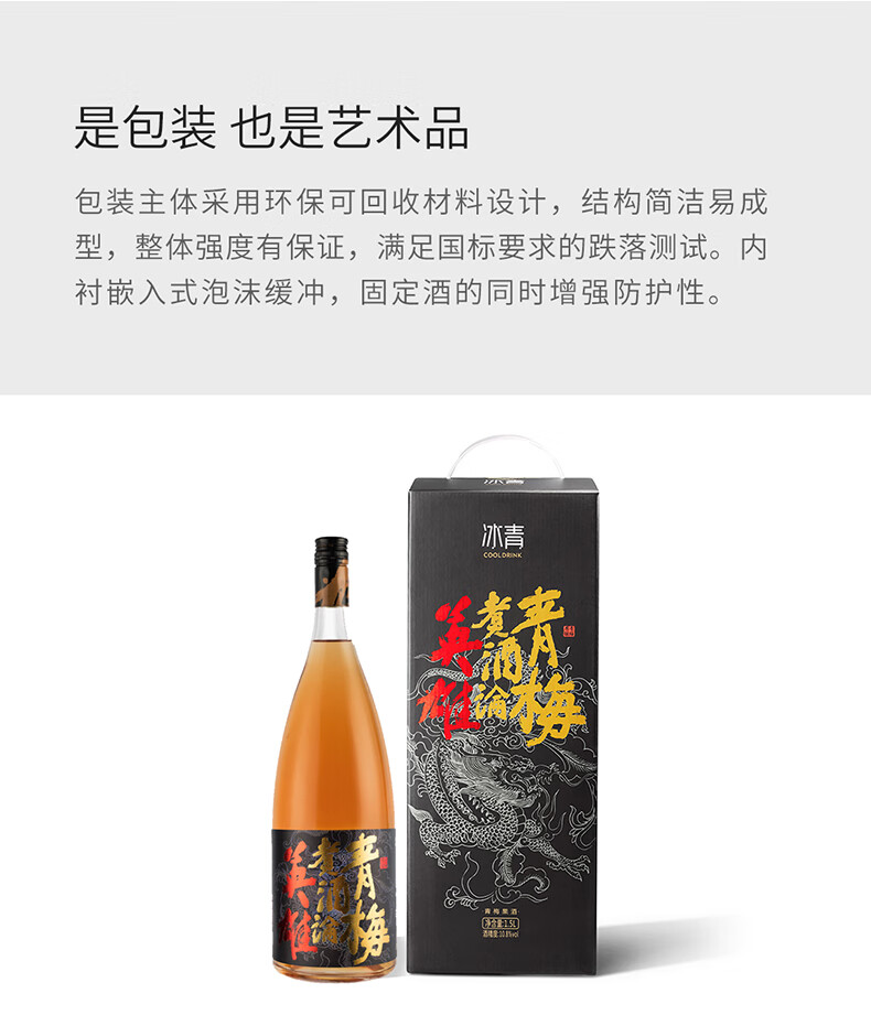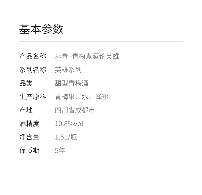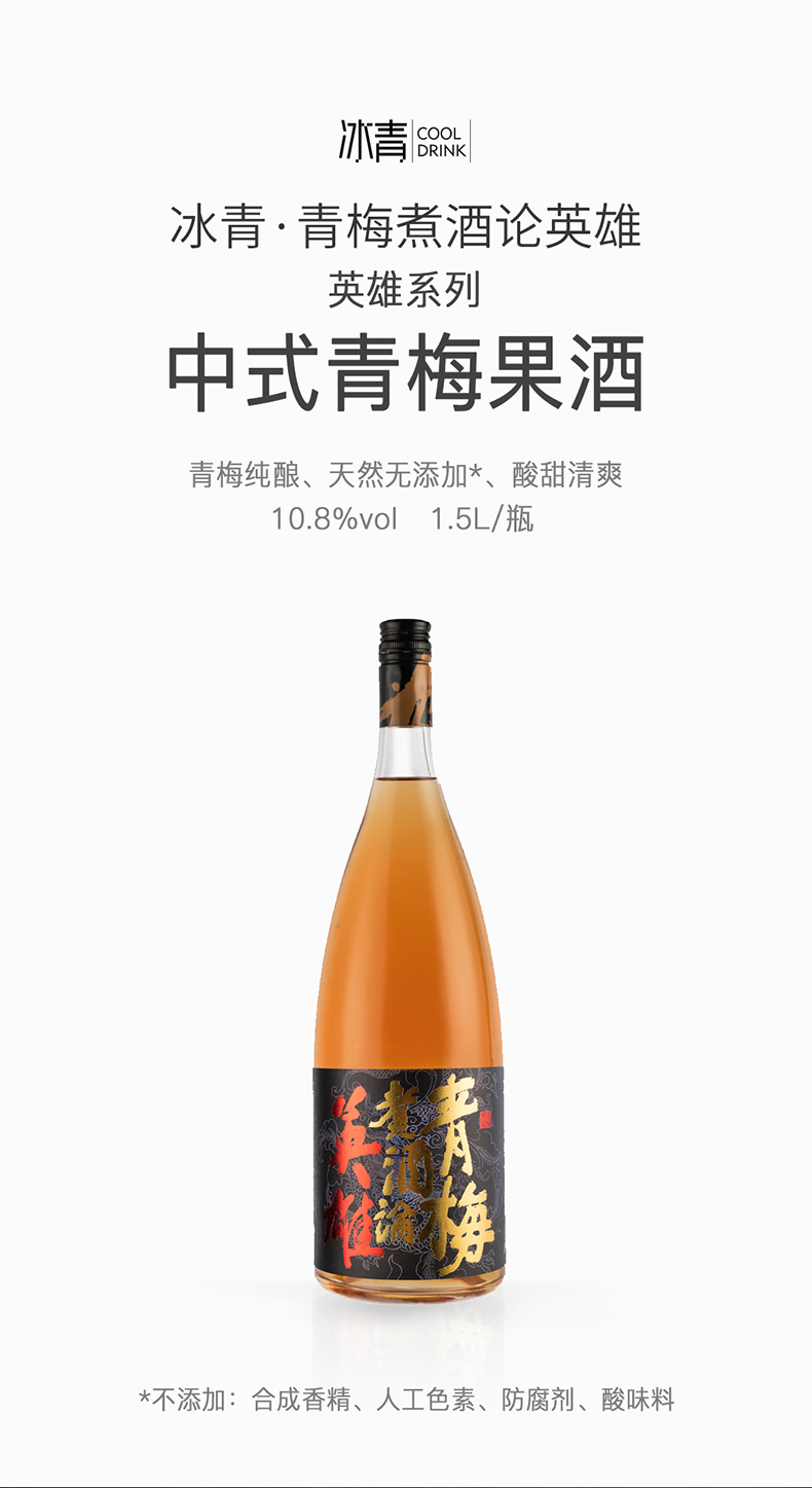 特性:其它;国产/进口:国产;产地:中国大陆;适用场景:家庭聚会,商务宴请,情侣约会,自斟自饮,亲友馈赠,闺蜜私语;包装:瓶装;容量:1L及以上;特性:其它;产地:中国大陆;原料:青梅果、水、蜂蜜;保质期:1825天;酒精度:10.8%vol;存储方法:干燥、通风、清洁、避光存放;包装:礼盒装;容量:1500mL;产品重量:1.5kg;包装清单:冰青·青梅煮酒论英雄1.5L青梅酒一瓶;