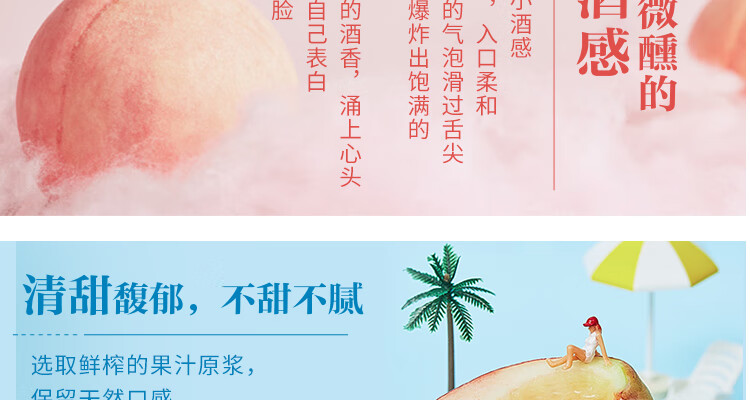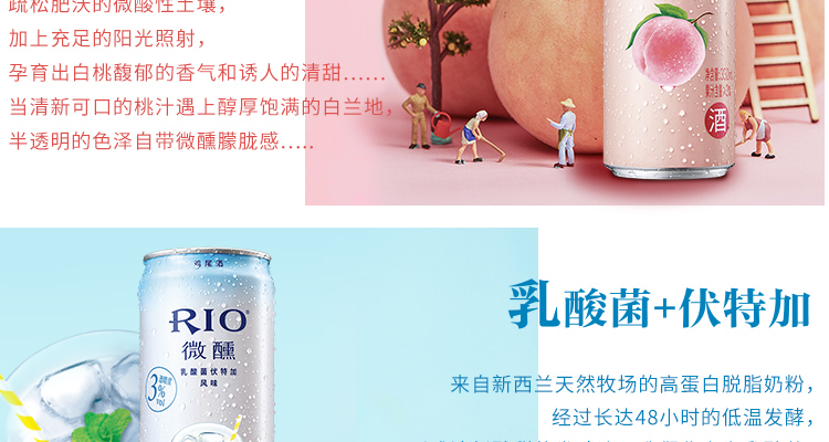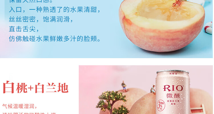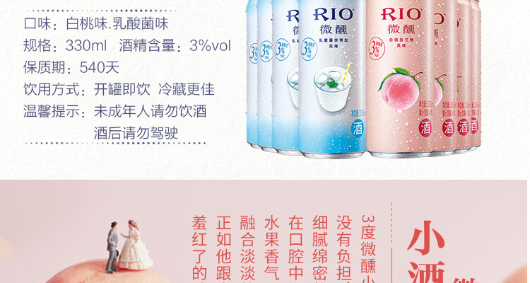 国产/进口:国产;产地:中国大陆;适用场景:家庭聚会,商务宴请,情侣约会,自斟自饮,亲友馈赠,闺蜜私语;包装:其它;容量:200-374mL;原料:水、白砂糖、果葡糖浆、食品添加剂、食用香精等;保质期:540天;酒精度:3%vol;存储方法:请置于阴凉干燥处,避免高温和阳光直晒,禁止加热或0℃以下冷冻,切勿撞击。;容量:330mL;产品重量:2.91kg;包装清单:锐澳 RIO 锐澳(RIO) 洋酒鸡尾酒 预调酒 微醺乳酸菌+白桃 330ml*8;