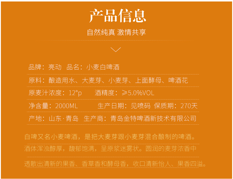 国产/进口:国产;产地:中国大陆;适用场景:家庭聚会,礼节拜访,情侣约会,自斟自饮,派对必备,烧烤撸串,酒吧夜店;包装:桶装;容量:500mL以上;类别:原浆啤酒;原料:酿造用水,大麦芽,小麦芽,上面酵母,啤酒花;系列:亮动;国产/进口:国产;保质期:270天;酒精度:5;原产地:中国大陆;原麦汁浓度:12;存储方法:5-25 ℃避光储存;类别:白啤酒;包装:桶装;产品重量:2.1kg;容量:2L;包装清单:2L*1;