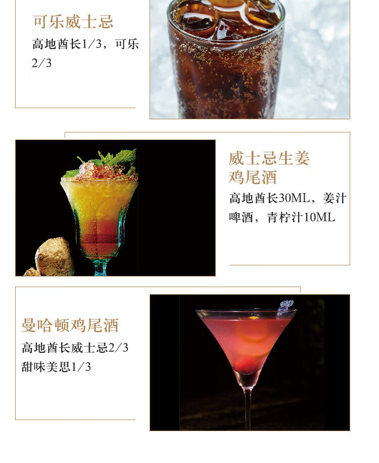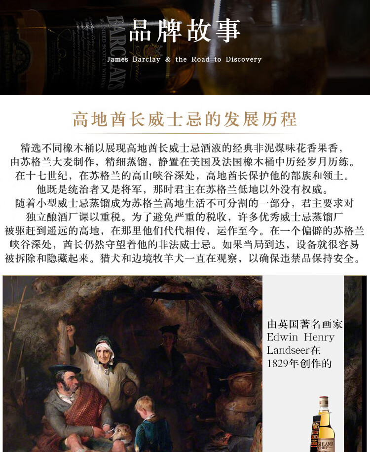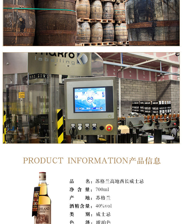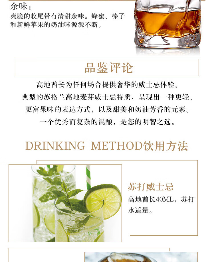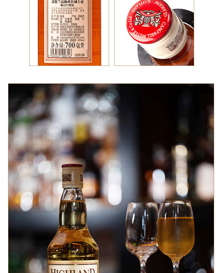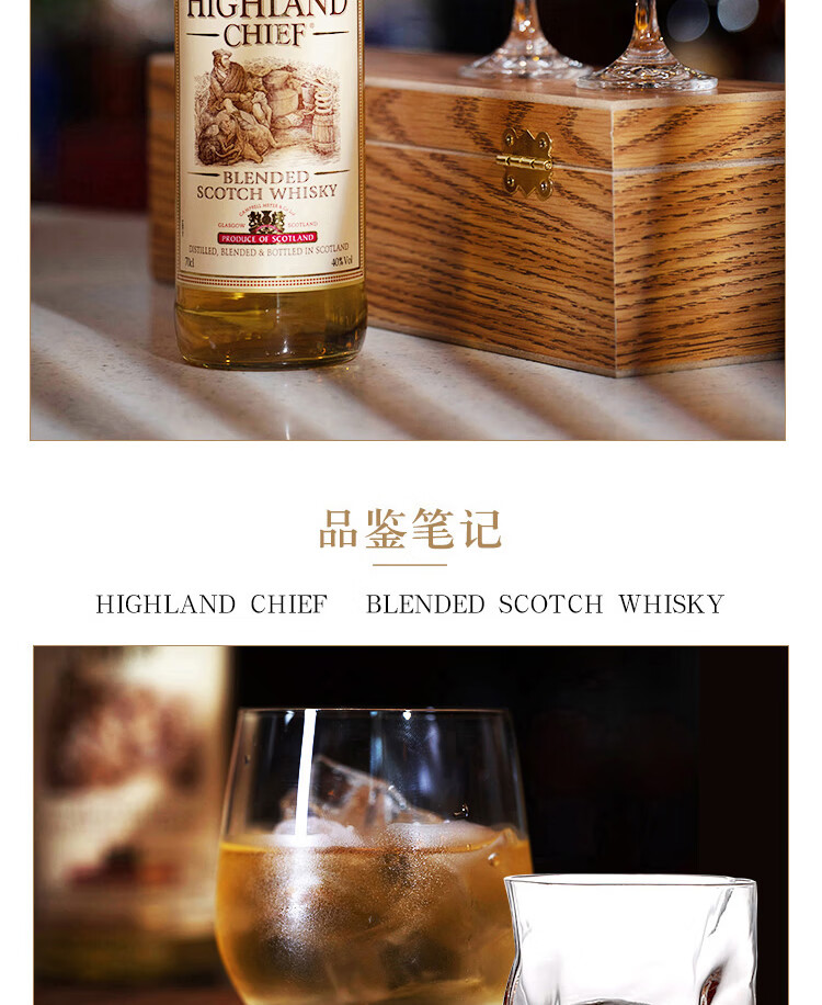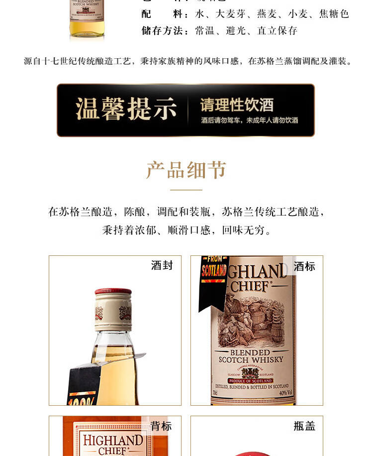 类型:调和威士忌;产地:苏格兰;适用场景:情侣约会,闺蜜私语,自斟自饮,亲友馈赠,家庭聚会,商务宴请;包装:瓶装;容量:700-999mL;阶段:小白入门;原料:水、大麦芽、燕麦、小麦、焦糖色;保质期:无质保;酒精度:40%vol;存储方法:避光保存;产品重量:1.2kg;容量:700mL;包装清单:高地酋长威士忌*700ML*1瓶;
