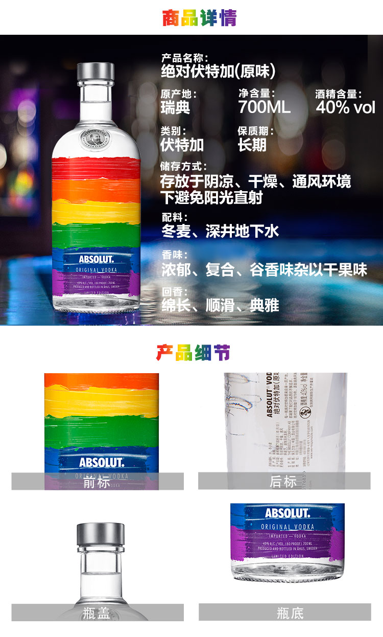 适用场景:家庭聚会,商务宴请,自斟自饮,亲友馈赠;包装:瓶装;容量:700-999mL;国产/进口:进口;产地:瑞典;原料:优质冬小麦、纯净深泉水;保质期:长期;酒精度:40%vol;存储方法:通风、干燥、阴凉处;容量:1.15mL;产品重量:700kg;包装清单:绝对伏特加(Absolut Vodka)洋酒 骄傲 限量版伏特加 700ml× 1;
