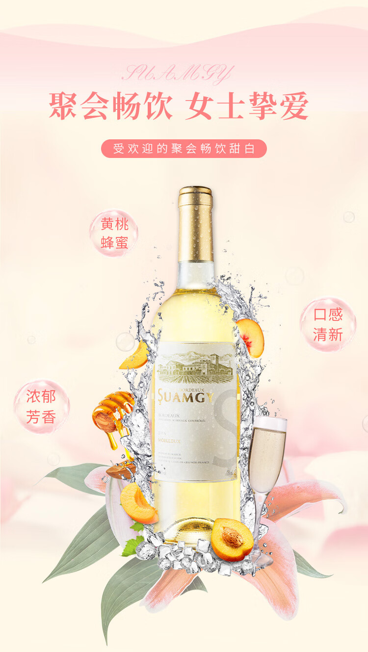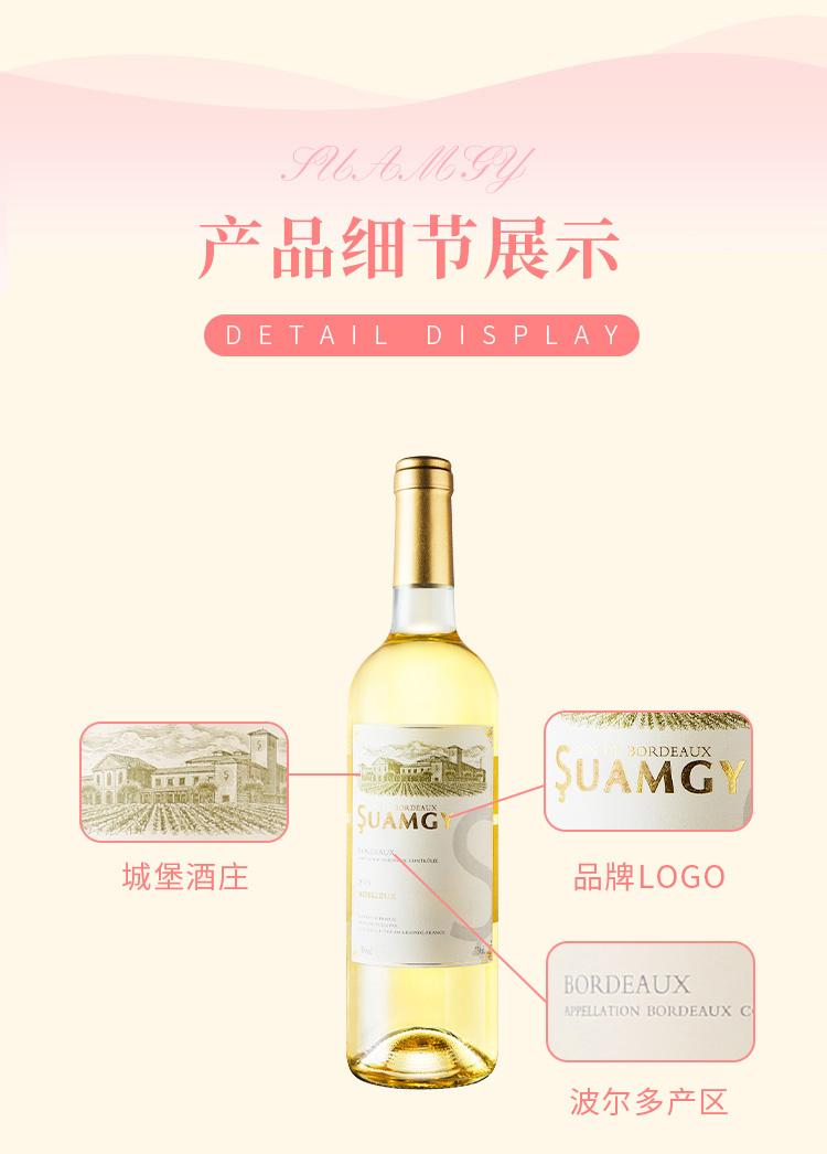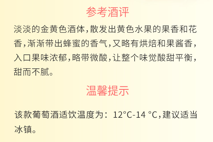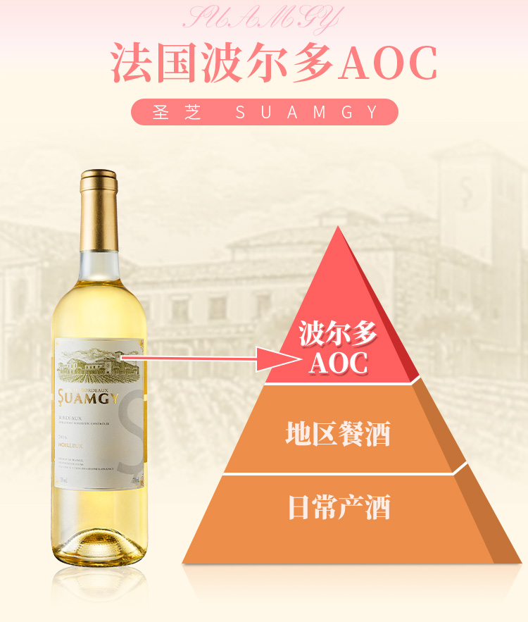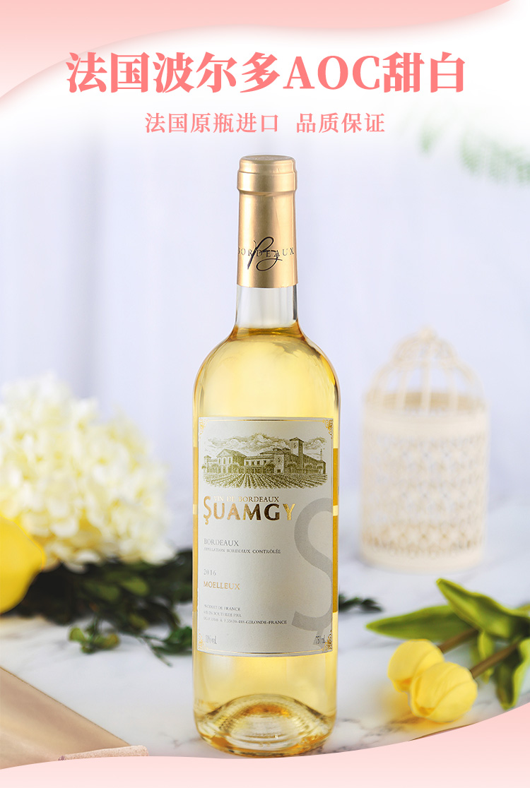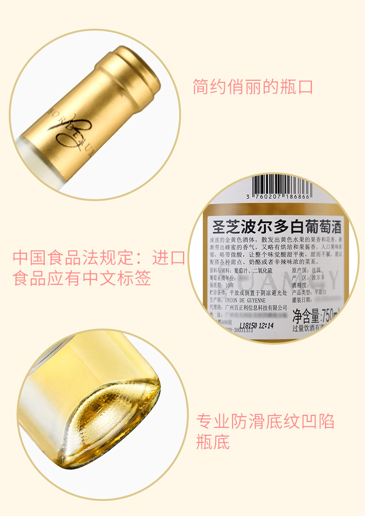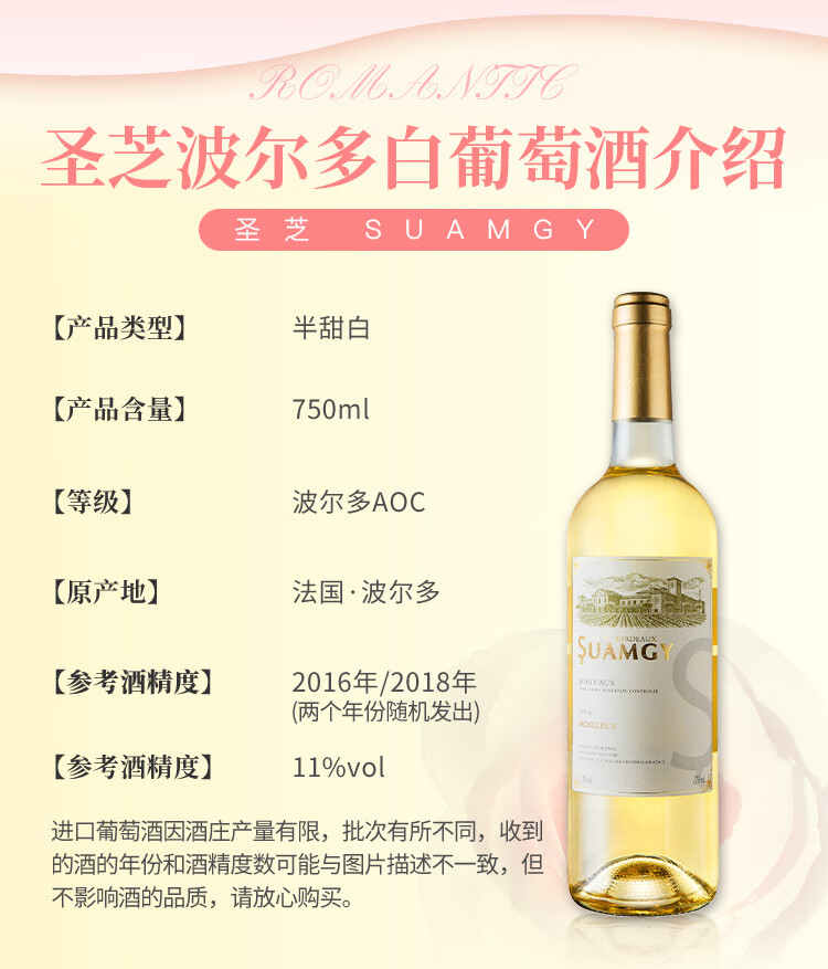 颜色:柠檬黄;口感:清新;特性:法定产区酒(AOC/AOP等);国产/进口:进口;适用场景:情侣约会,闺蜜私语,派对活动;包装:瓶装;酸度:中酸;类别:白葡萄酒;葡萄品种:长相思(Sauvignon Blanc),其它;类型:静止酒;香型:花香,果香;产地:法国;容量:750mL;甜度:半甜型;保质期:10年;酒精度:11%vol;原产地:法国;存储方法:平放或倒置于阴凉避光处;产品重量:1.18kg;容量:750ml;包装清单:圣芝波尔多白葡萄酒*1;