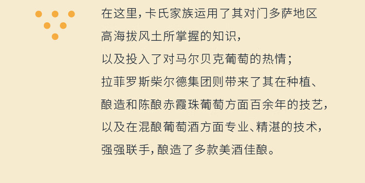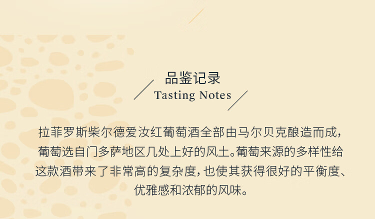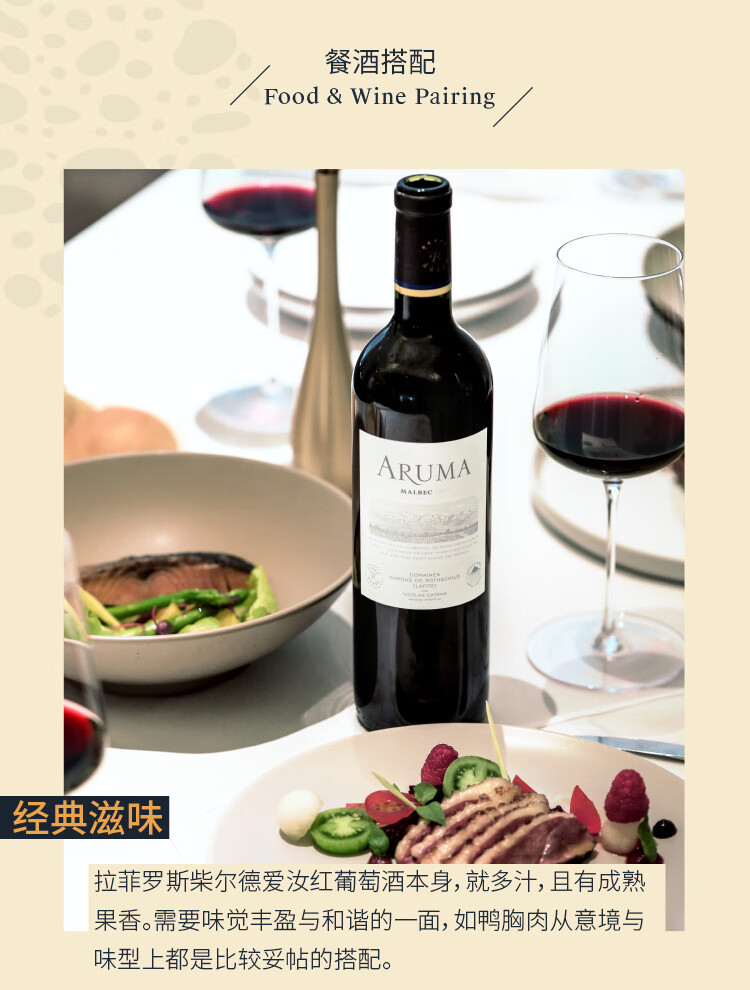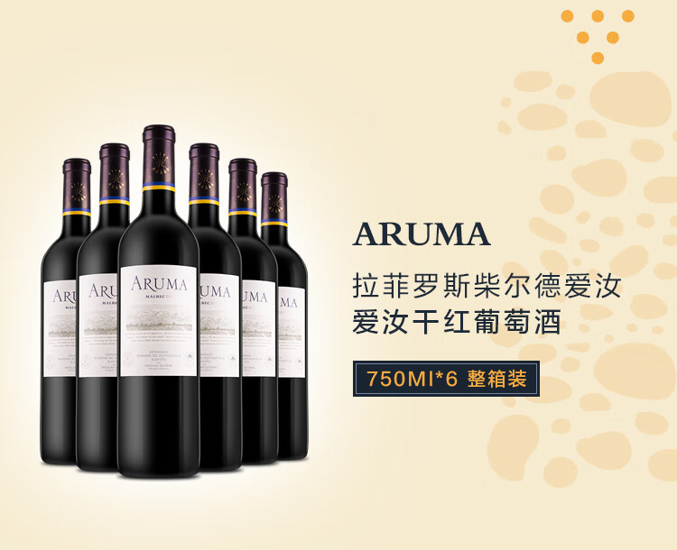 颜色:宝石红;口感:饱满;特性:精品葡萄酒;国产/进口:进口;适用场景:礼节拜访,商务宴请,婚礼婚宴,情侣约会,家庭聚会,自斟自饮,闺蜜私语,派对活动;包装:整箱装;酸度:低酸;类别:红葡萄酒;葡萄品种:马尔贝克(Malbec);类型:静止酒;香型:果香;产地:阿根廷;容量:750mL;甜度:干型;保质期:长期;酒精度:见背标;原产地:阿根廷;存储方法:避光、卧放;容量:750ml;产品重量:7kg;包装清单:拉菲(LAFITE)爱汝干红葡萄酒 750ml*6;