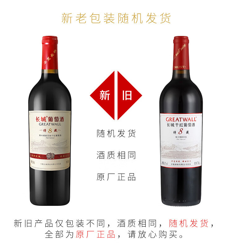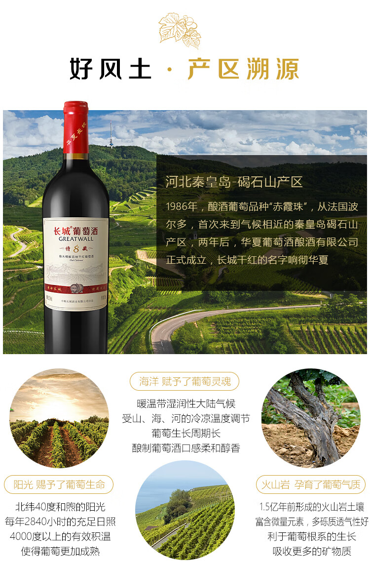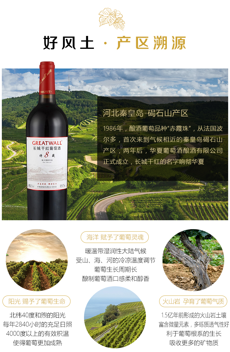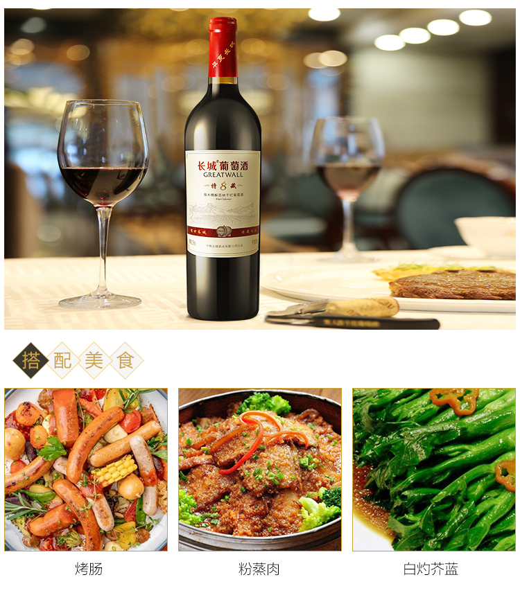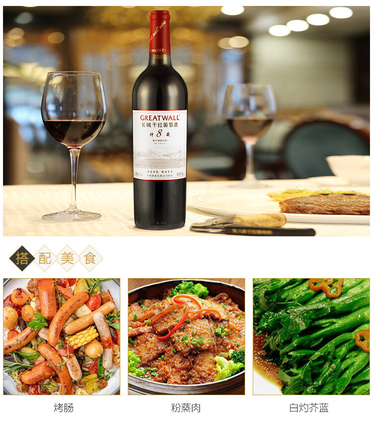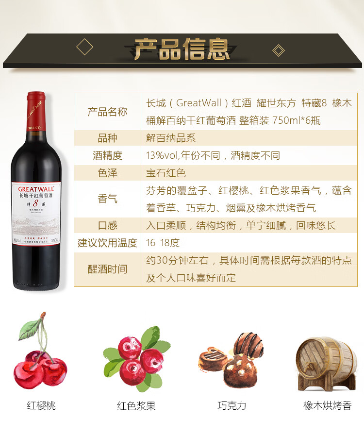 颜色:宝石红;采摘年份:2018年;口感:饱满;特性:精品葡萄酒;国产/进口:国产;适用场景:家庭聚会,礼节拜访,商务宴请,婚礼婚宴,情侣约会,自斟自饮,派对活动;包装:整箱装;酸度:中酸;类别:红葡萄酒;葡萄品种:赤霞珠(Cabernet Sauvignon),蛇龙珠(Cabernet Gernischt),品丽珠(Cabernet Franc);类型:静止酒;香型:果香,烘烤,巧克力;产地:中国大陆;容量:750mL;甜度:干型;保质期:3650天;酒精度:13%vol;原产地:中国大陆;存储方法:避免阳光直射,于5℃~25℃干燥通风处卧放或倒放为宜;容量:750ml;产品重量:9kg;包装清单:长城(GreatWall)红酒 耀世东方 特藏8 橡木桶解百纳干红葡萄酒 整箱装 750ml*6瓶 *1箱;