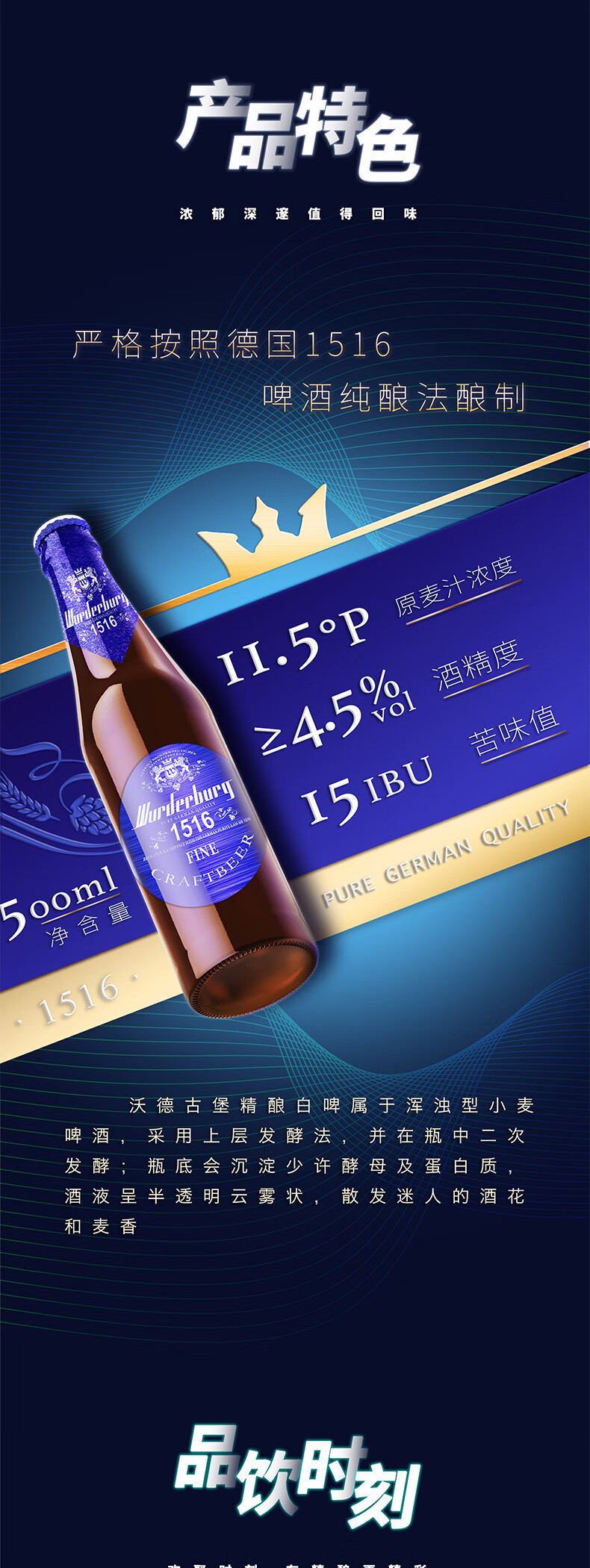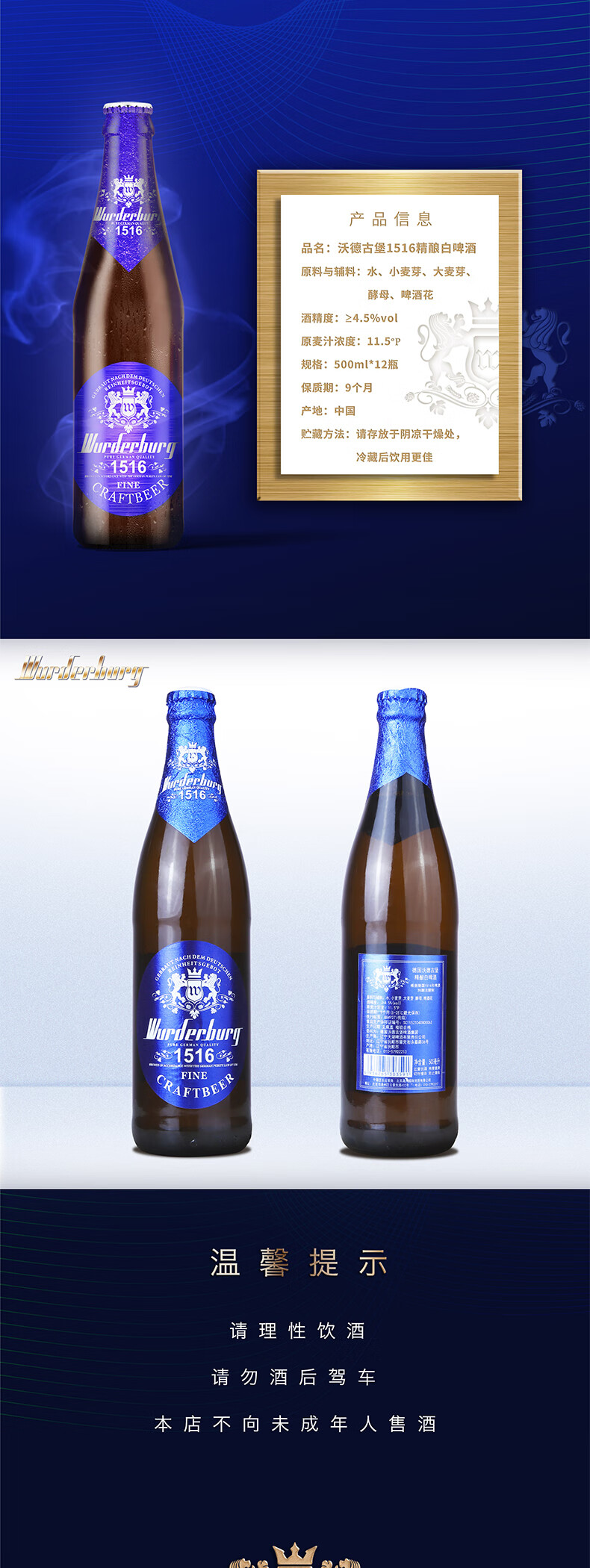 国产/进口:国产;产地:中国大陆;适用场景:礼节拜访,家庭聚会,自斟自饮,情侣约会,烧烤撸串,派对必备,酒吧夜店;包装:组合装;容量:500mL;类别:精酿;原料:水,小麦芽,大麦芽,酵母,啤酒花;保质期:9个月;酒精度:4.5;原产地:中国大陆;原麦汁浓度:11.5;存储方法:避光保存;容量:500ml;产品重量:10.9kg;包装清单:德国沃德古堡 wurderburg 精酿白啤酒瓶装 500ml*12瓶;