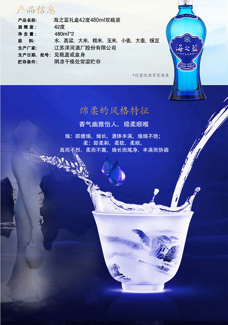 包装:礼盒装;容量:376-499mL;香型:浓香型;产地:江苏;度数:40-49度;酒精度:42%vol;容量:480ml*2;产品重量:3600g;包装清单:洋河蓝色经典 海之蓝 42度 礼盒装 480ml*2瓶白酒 口感绵柔浓香型(新老包装随机发放);